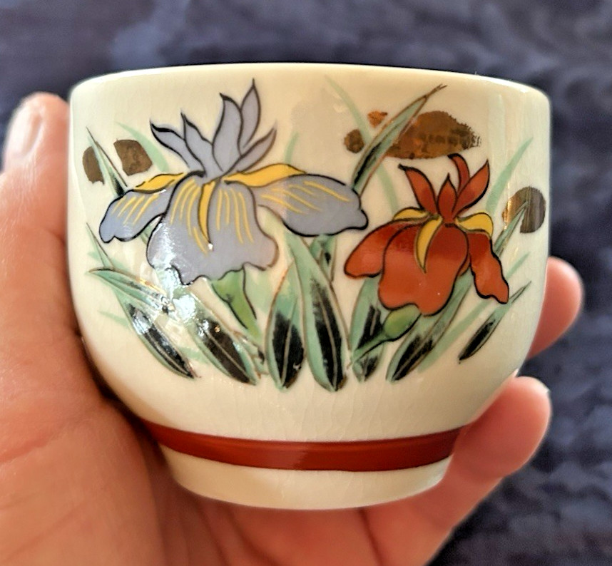 • Vintage Japanese Porcelain Tea Cups Yunomi Hand Painted 3 Floral 1 Bird Set of 4