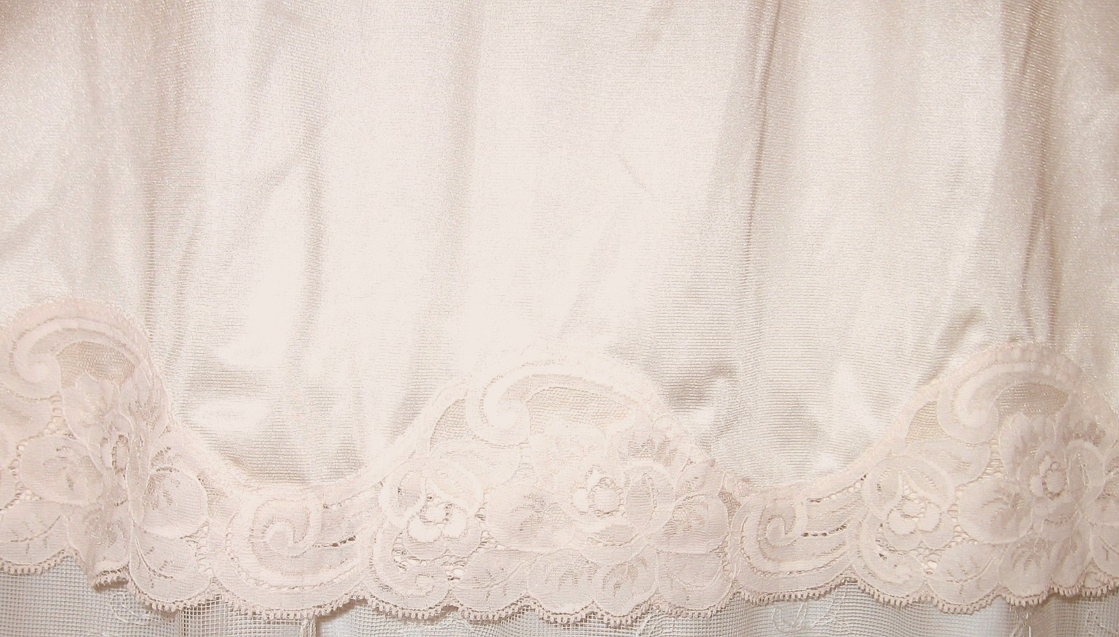как выглядит NEW VTG MED VANITY FAIR CHAMPAGNE 27" LONG SILKY 3 1/2" LACE HEM HALF SLIP фото