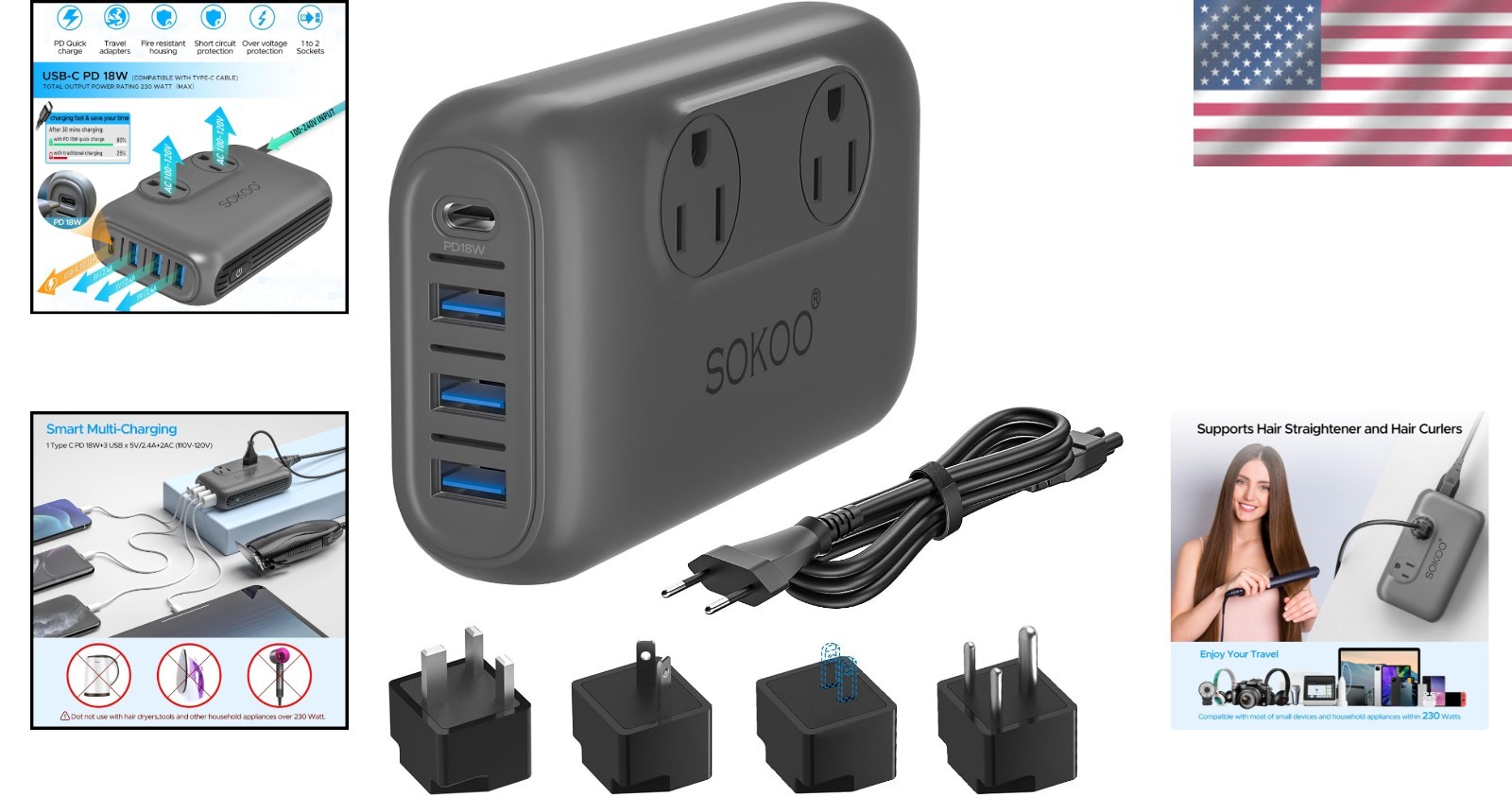 Travel-Friendly 230W Voltage Converter - Supports 6 Devices with USB Fast Charge