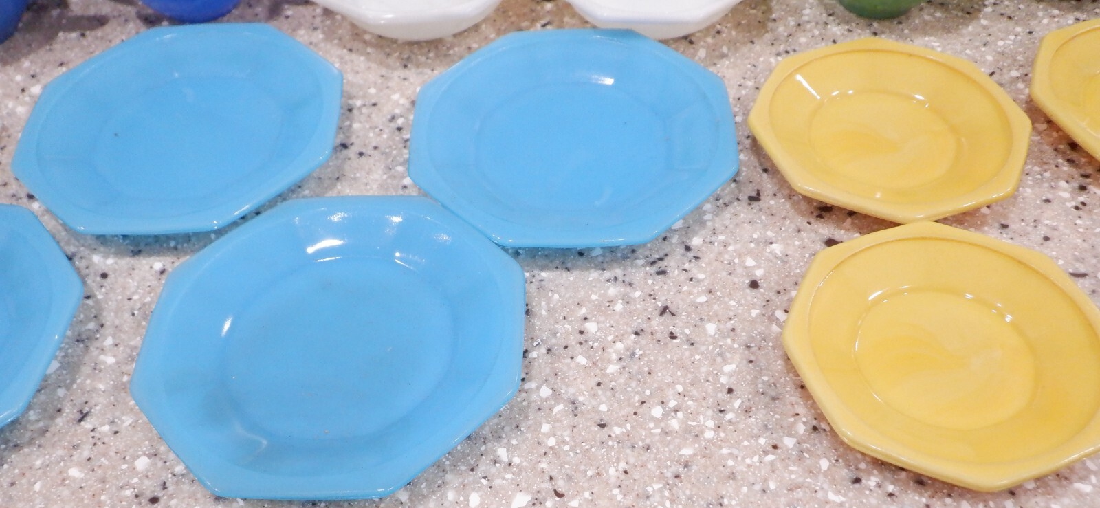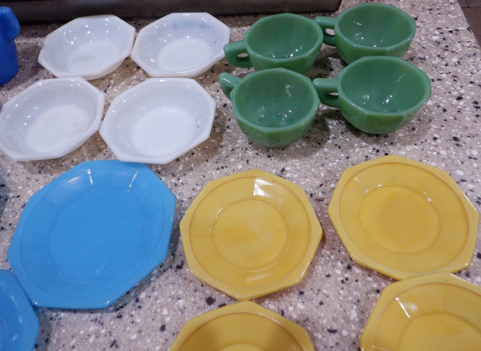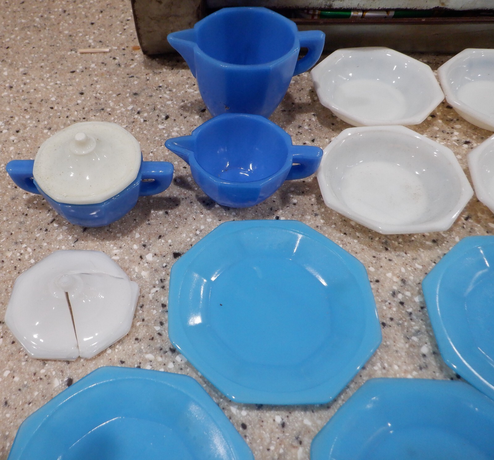 21 piece Vintage Toy Dishes Childs Slag Glass Tea Set Jadite Carnival - Very Old