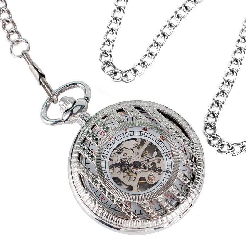 Silver Hollow Stripe Case Mens Pendant Hand Winding Mechanical Pocket Watch Gift
