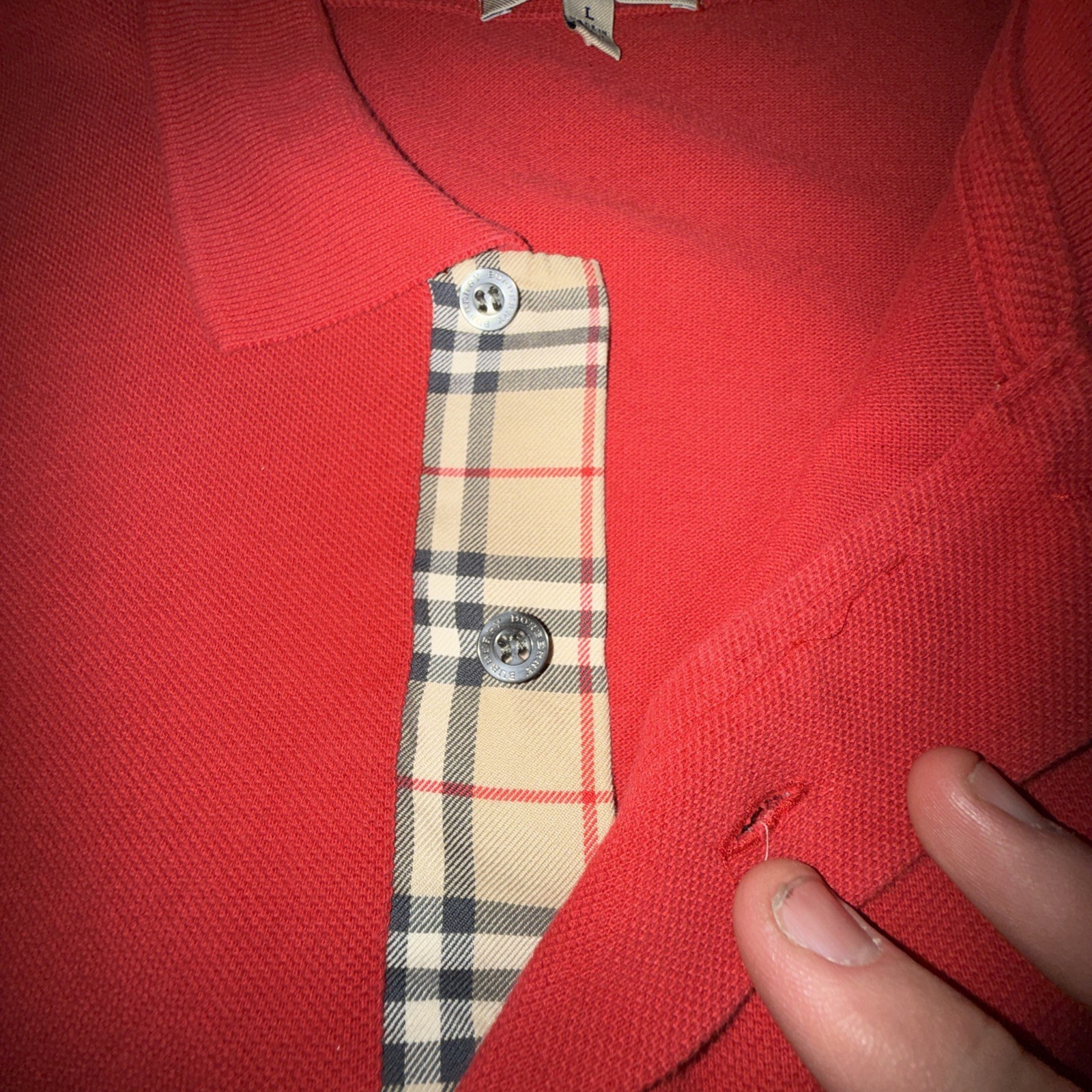 Burberry London Men s Large Red Polo Pique Cotton Nova Check Placket Vintage UK