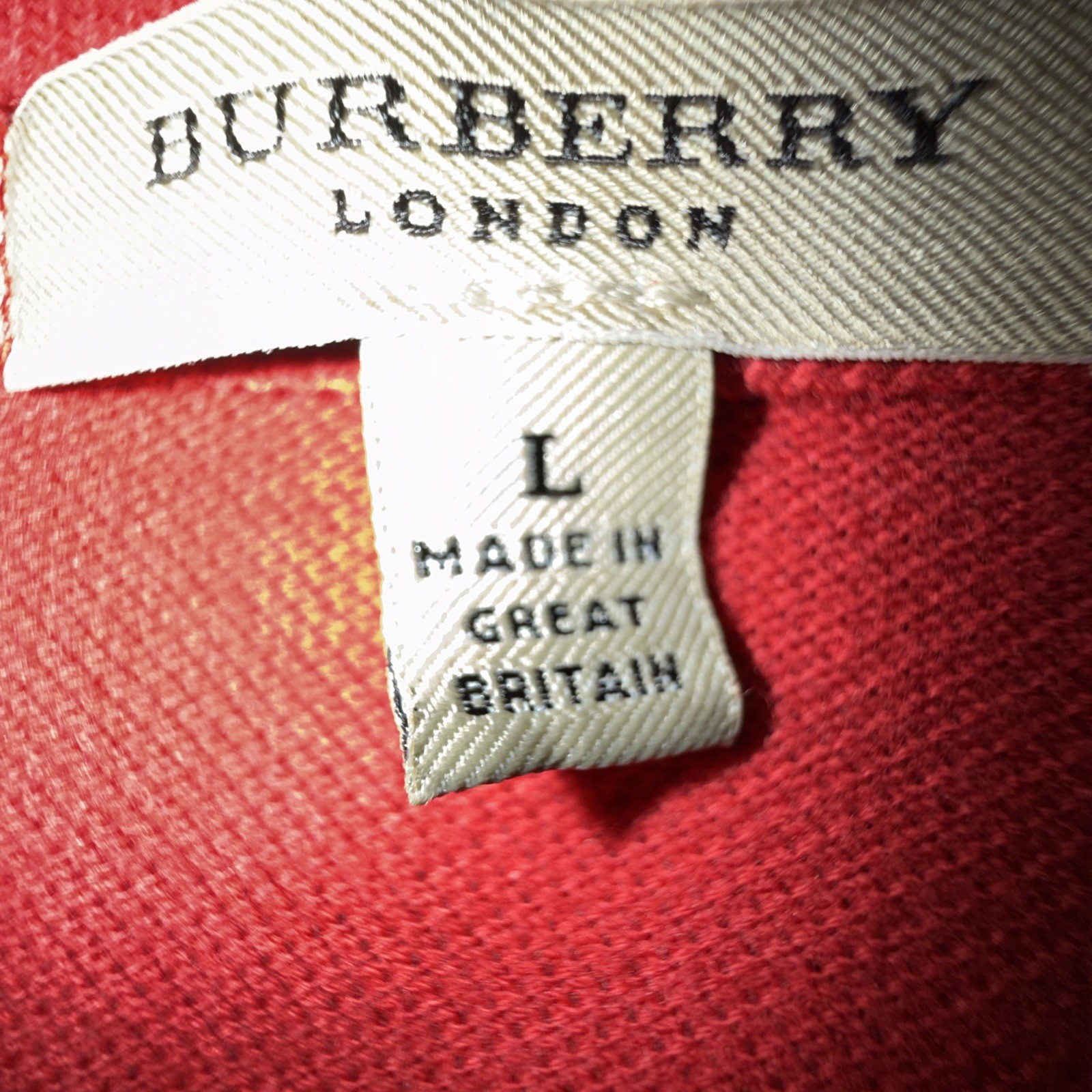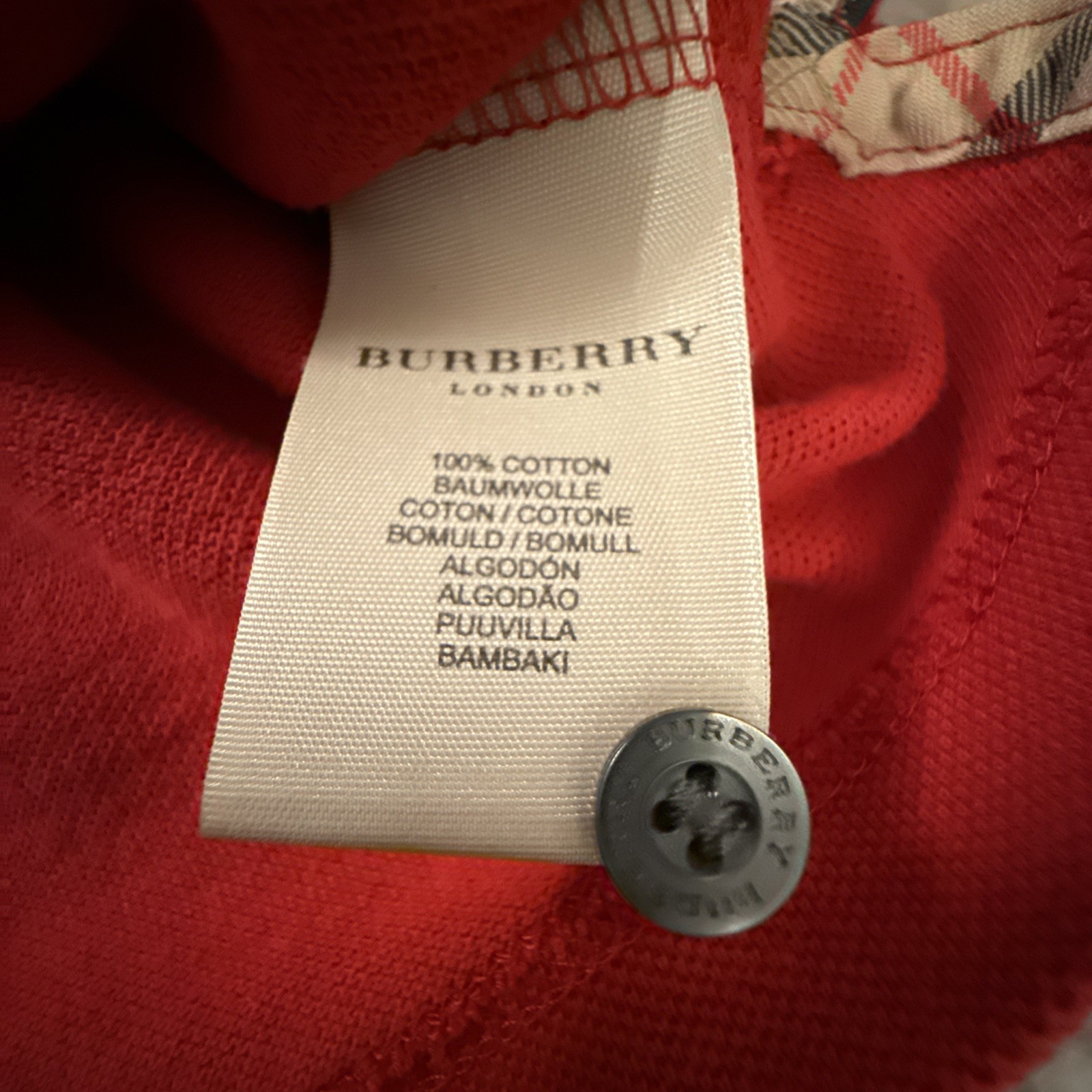 как выглядит Burberry London Men s Large Red Polo Pique Cotton Nova Check Placket Vintage UK фото