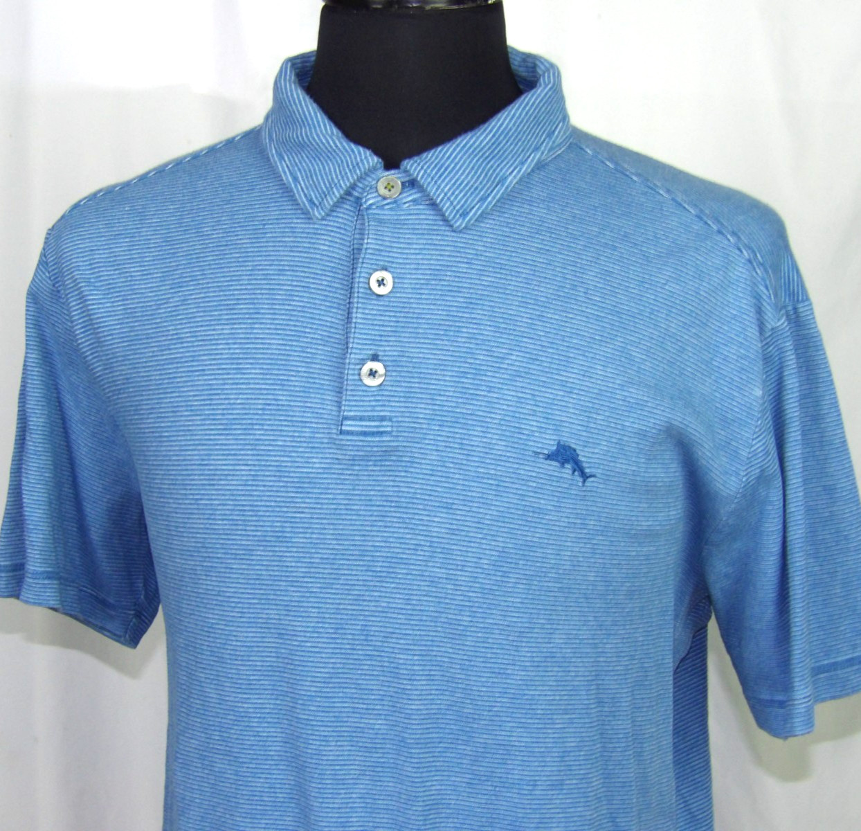 как выглядит Tommy Bahama Blue Striped Marlin Logo Smooth Cotton Polo Golf Shirt Men