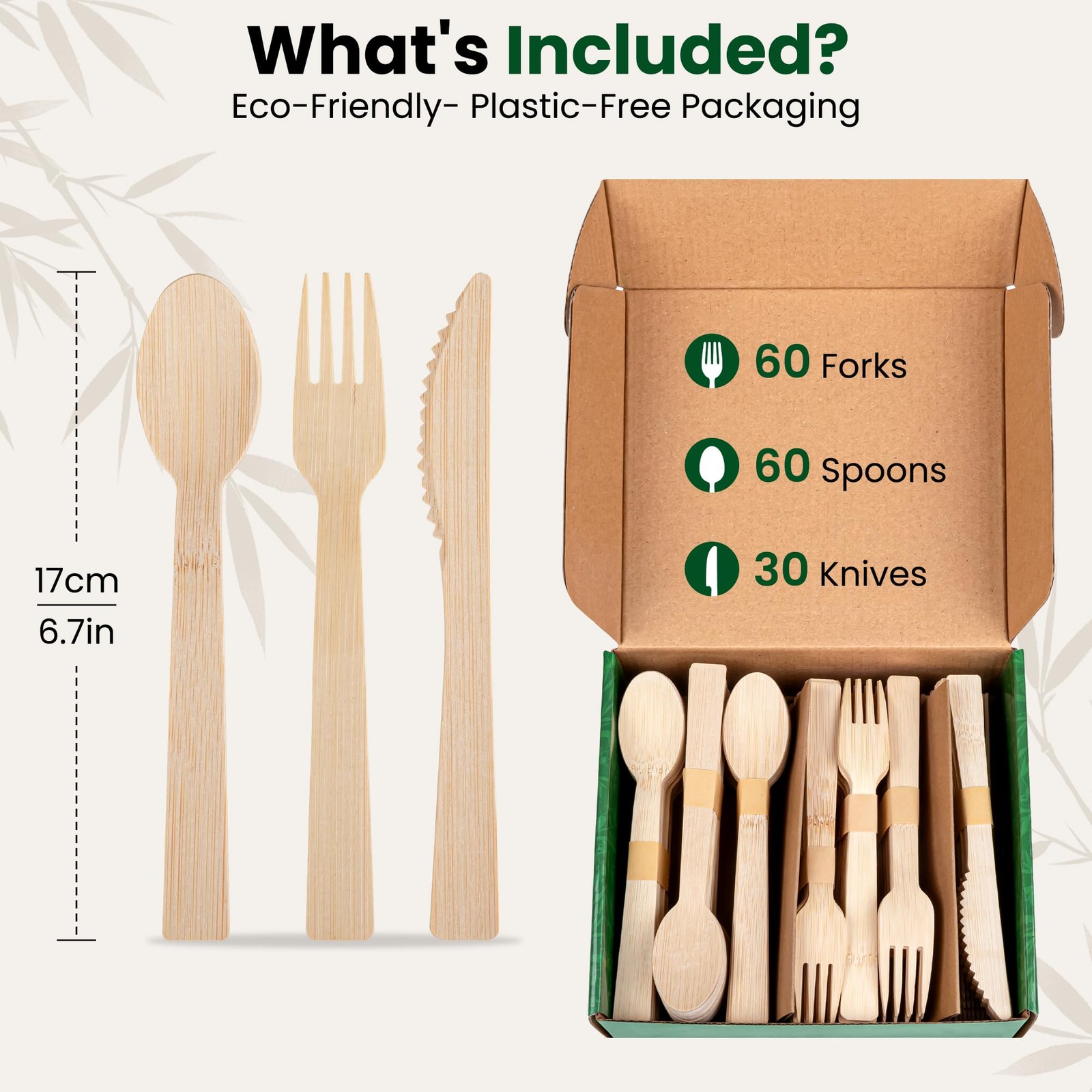 Set Name: Bamboo Cutlery Set Of 150 - 60 Forks, 60 Spoons, 30 Knives