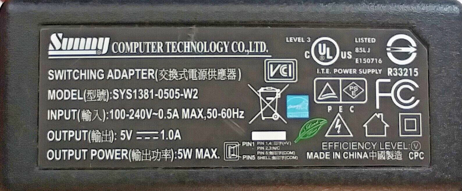Sunny SYS1381-0505W2 AC Adapter Power Supply 5 Volt with mini USB Plug