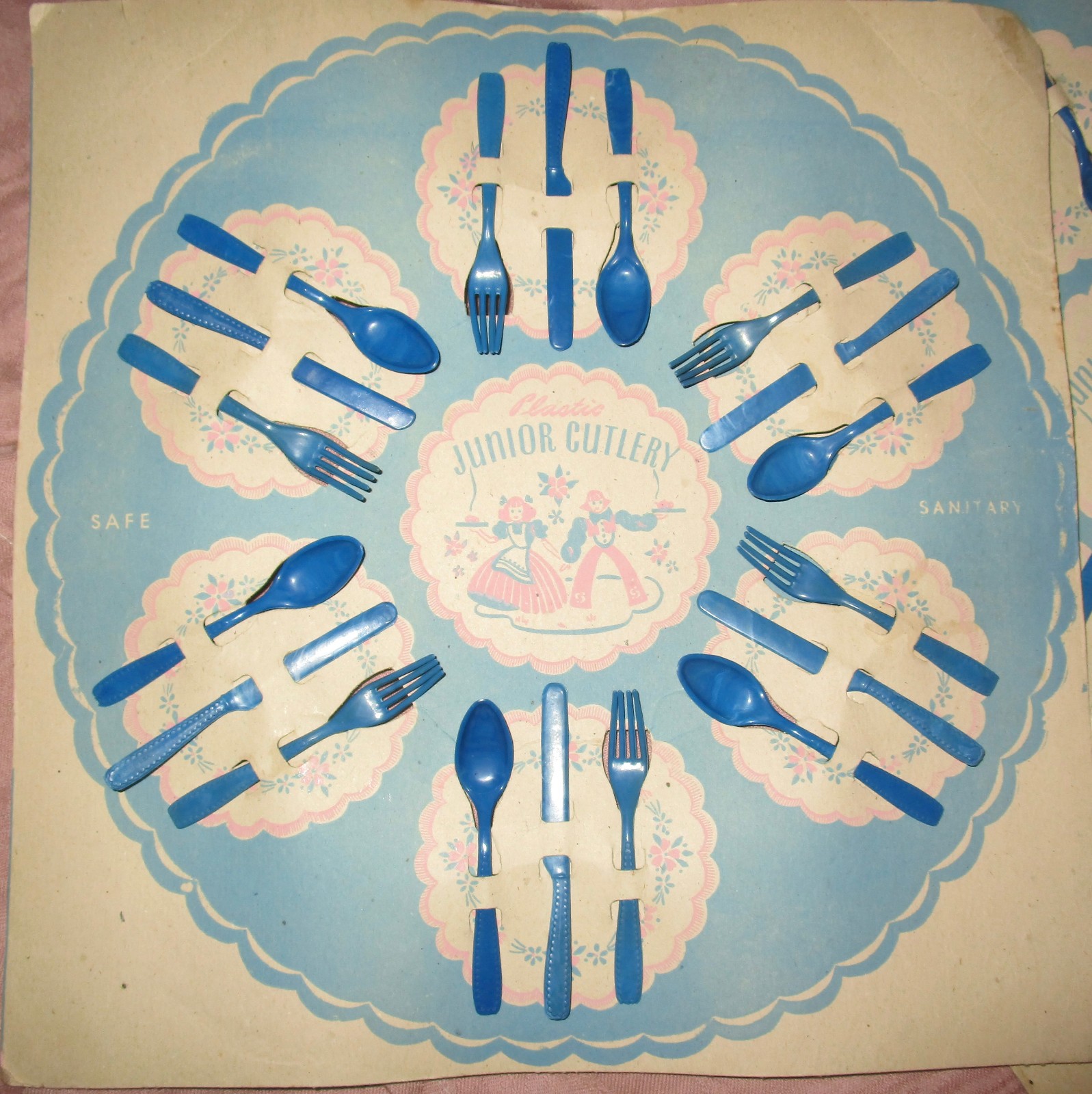 2 VTG PLASTIC TOY CUTLERY SETS New Unused on ORIG CARD BLUE PLAY KITCHEN