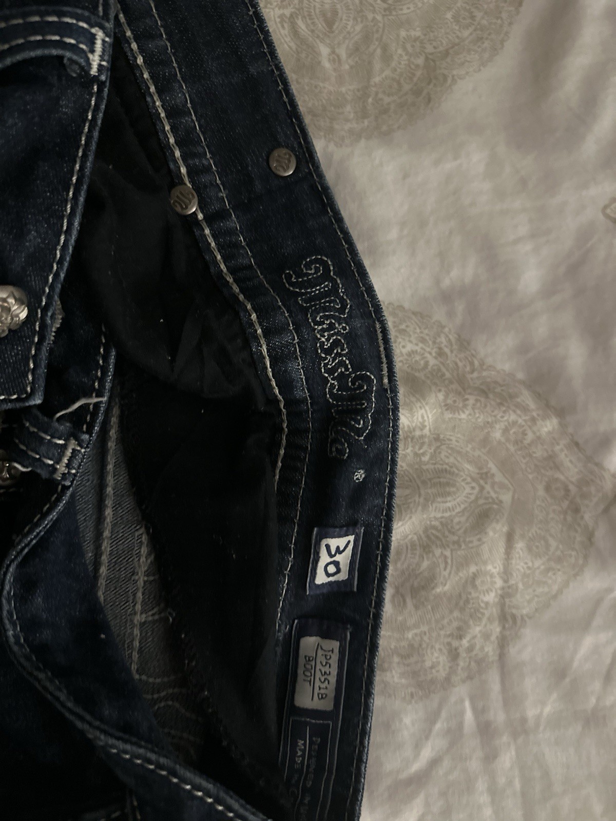 как выглядит Miss Me Womens Dark Wash Blue Bootcut Jeans Rhinestone 5-Pocket Mid Rise фото