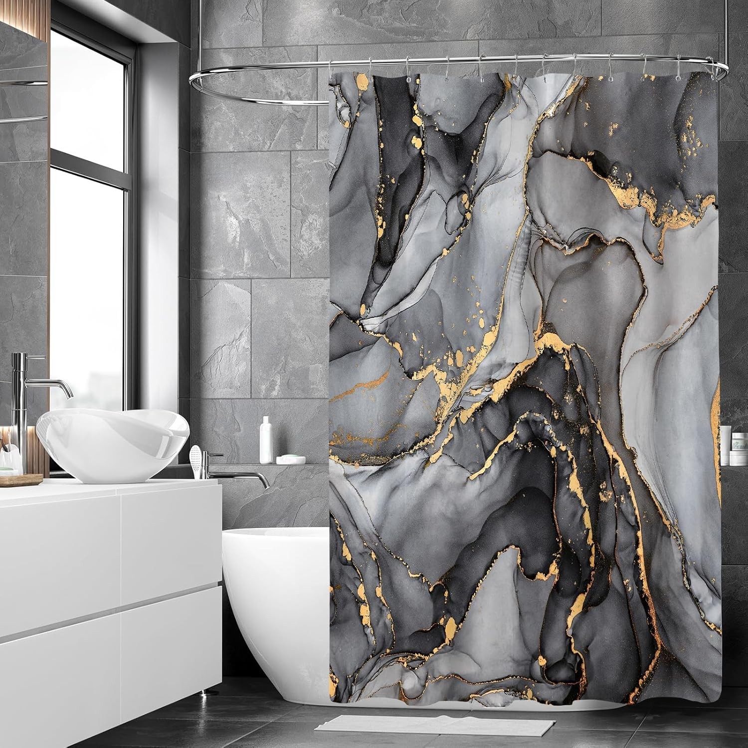 NBVKO 4 Pcs Black Marble Shower Curtain Sets with Rugs Gold Bathroom Sets wit...