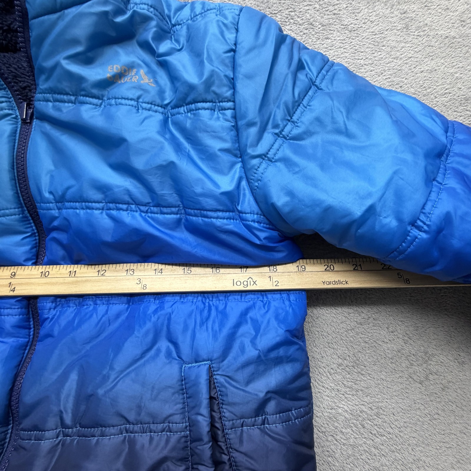 как выглядит Eddie Bauer Jacket Youth Large 14-16 Blue Ombre Reversible Hooded Puffer Sherpa фото