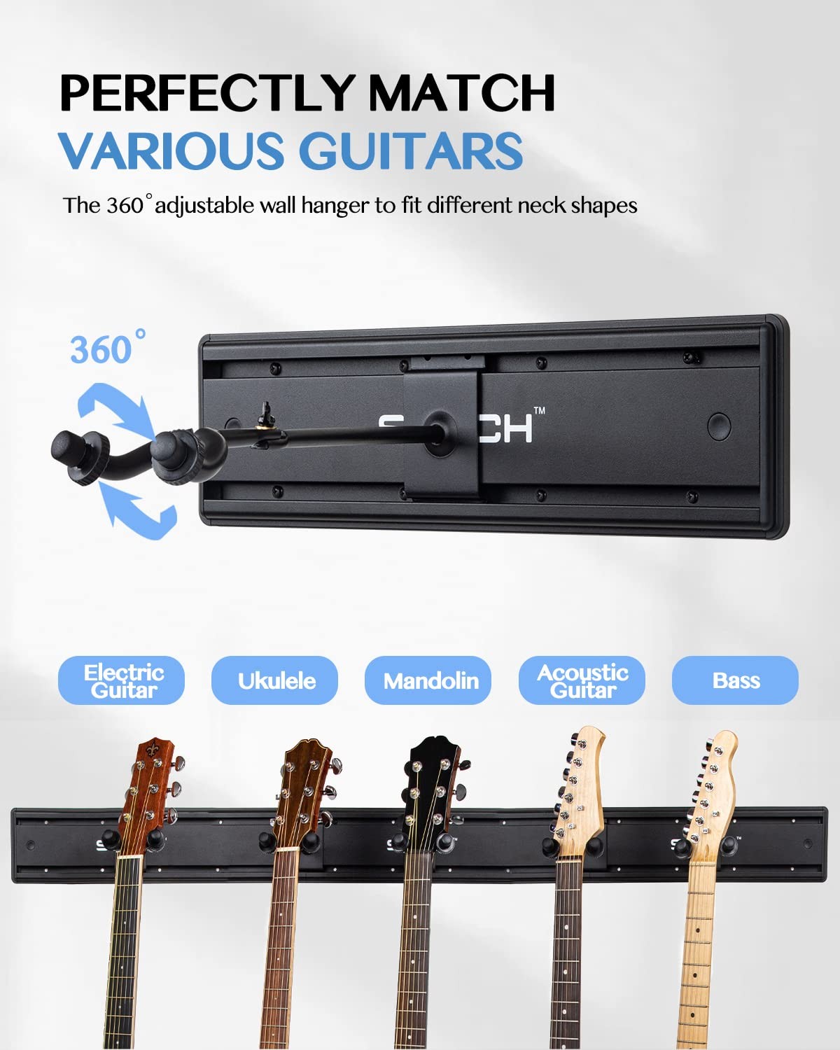 Guitar Wall Mount Hangers - Holds 5 Guitars, Aluminum Painted Black, Strong A...