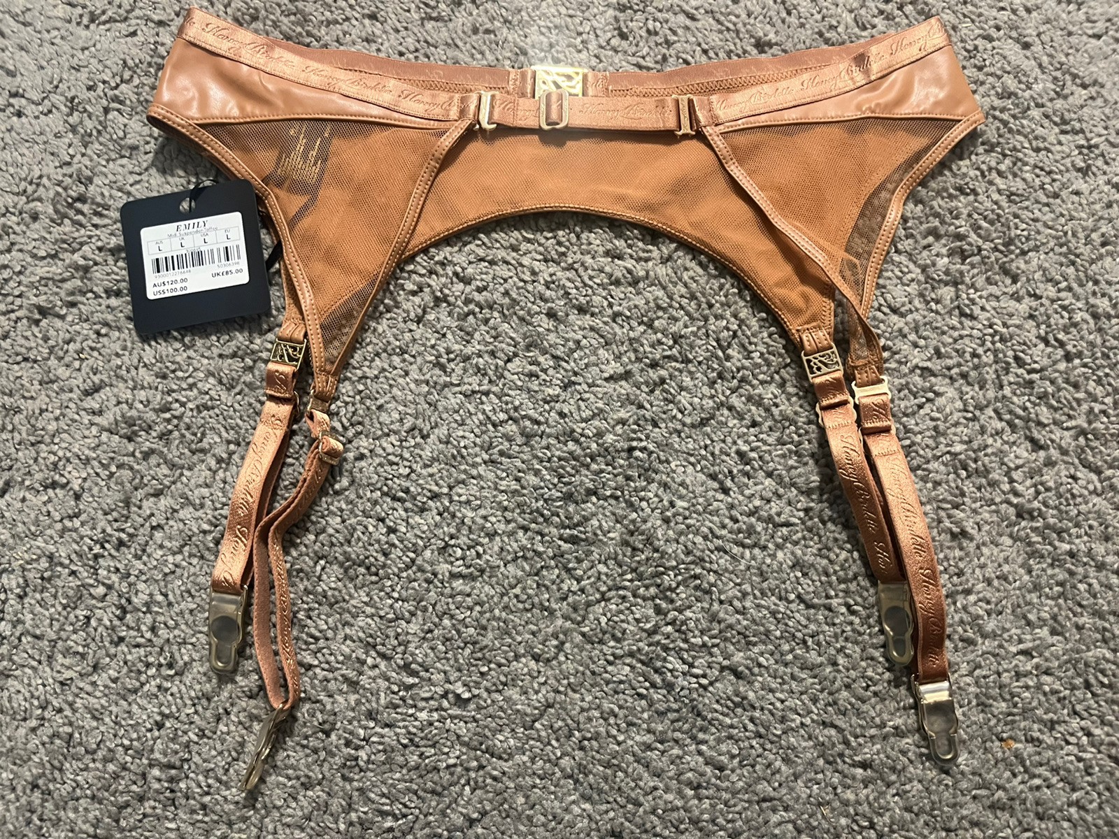 как выглядит Honey Birdette Faux Leather Toffee Emily Midi Suspender / Garter - Large NWT фото