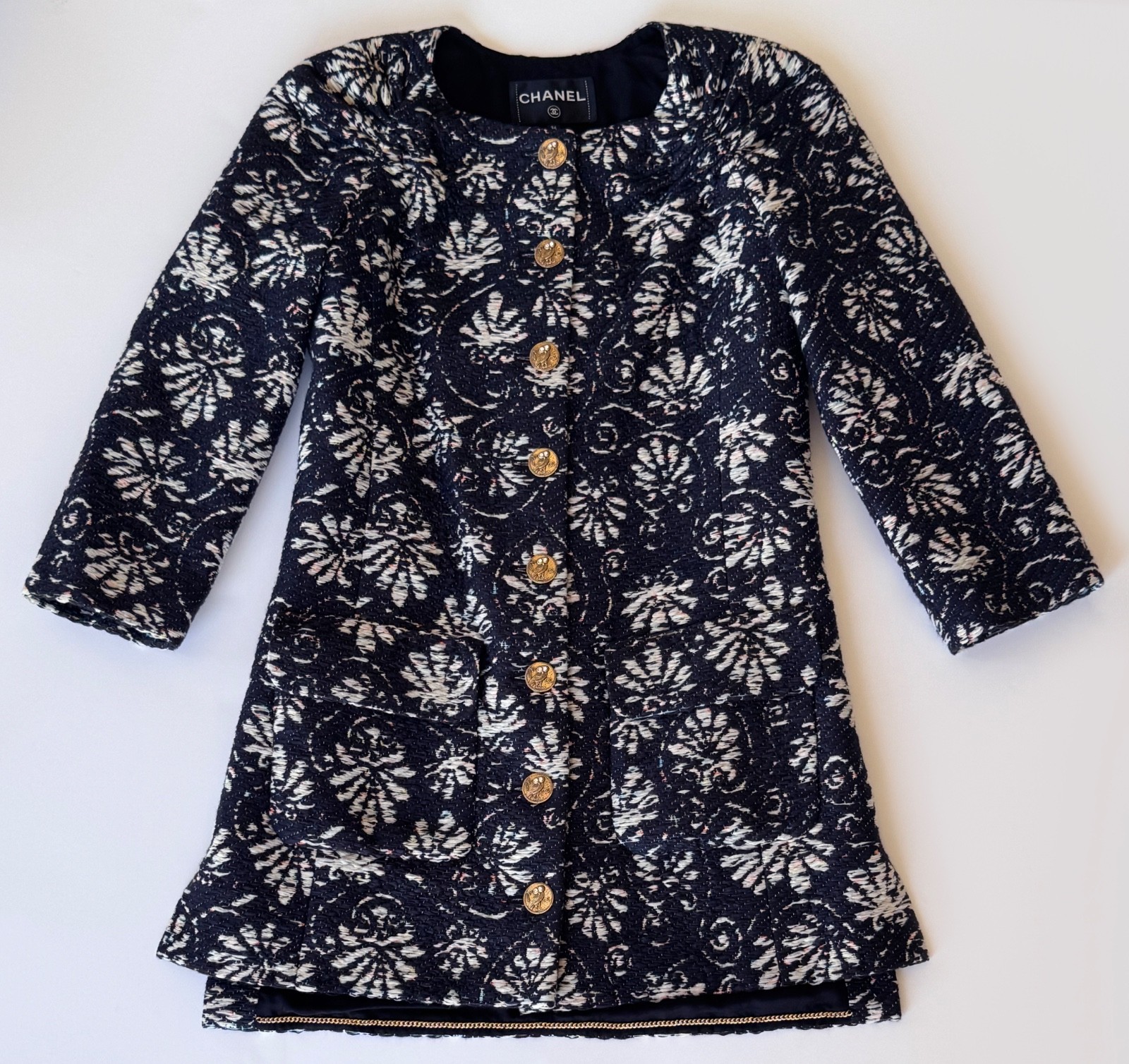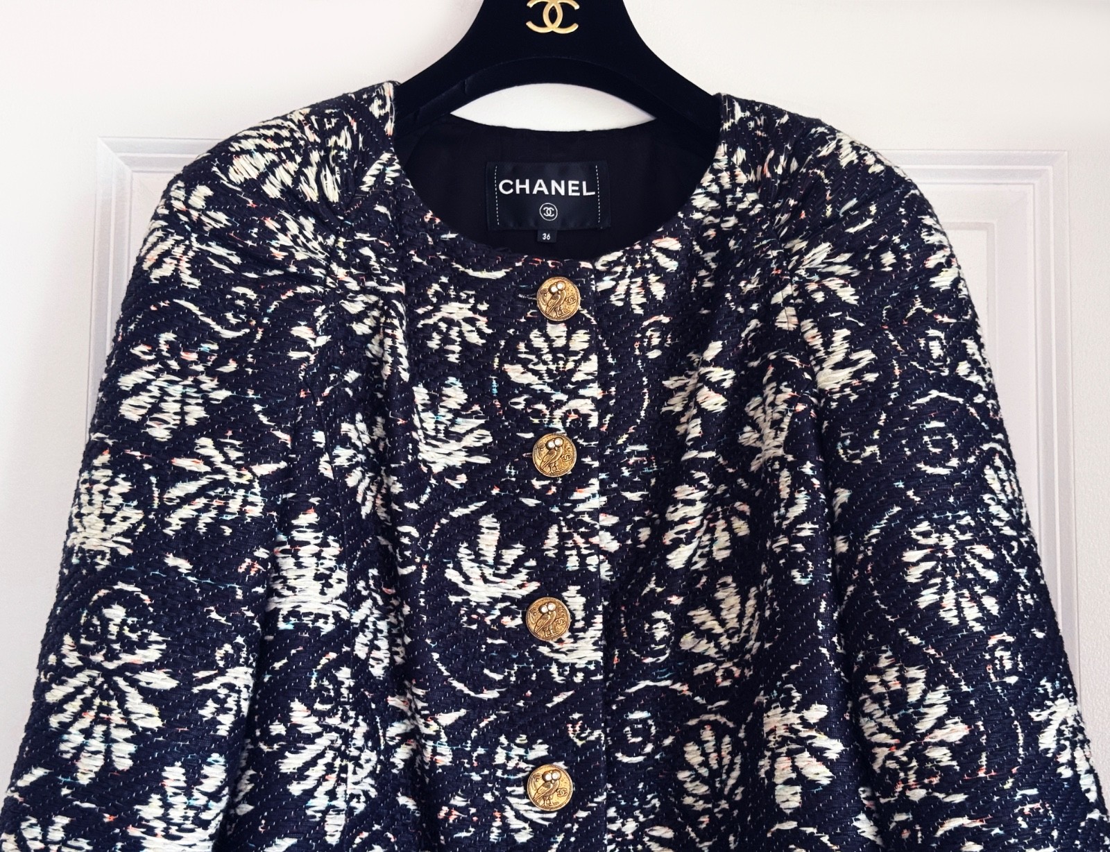как выглядит CHANEL 18C GREECE BLACK MULTICOLOR JACQUARD TWEED JACKET 36 фото