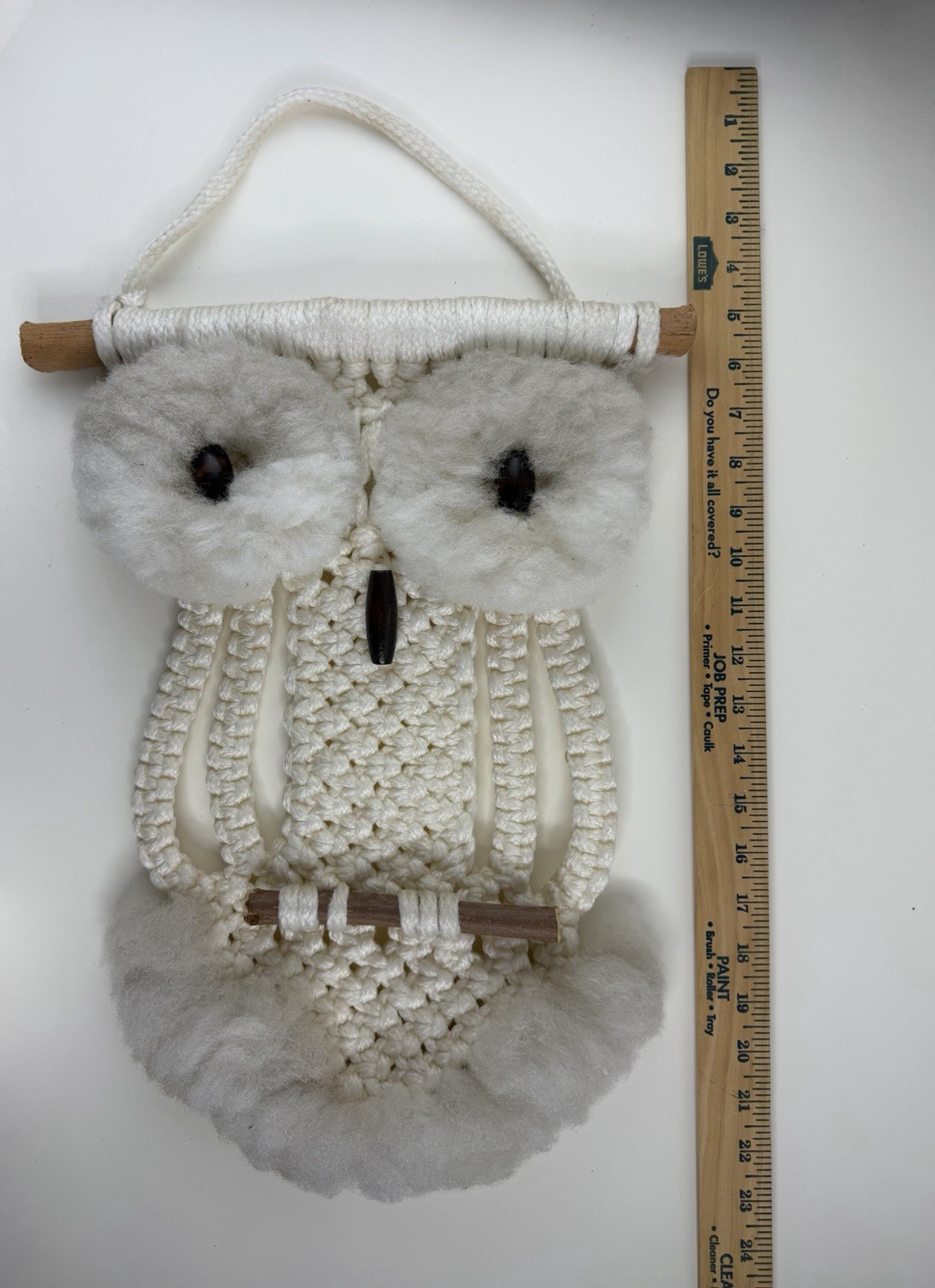 как выглядит Vintage Macrame Owl Mid Century Modern Boho Jute Wall Hanging Fluffy Wood Eyes фото