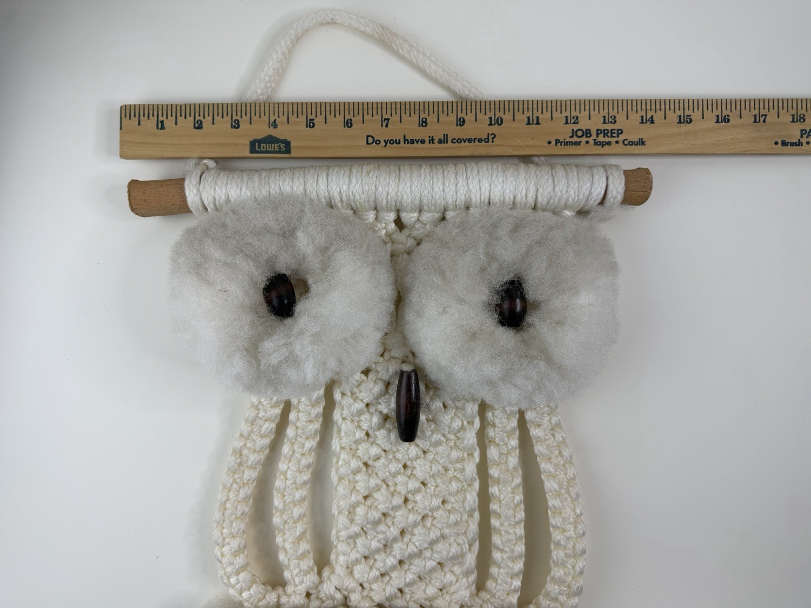 Vintage Macrame Owl Mid Century Modern Boho Jute Wall Hanging Fluffy Wood Eyes