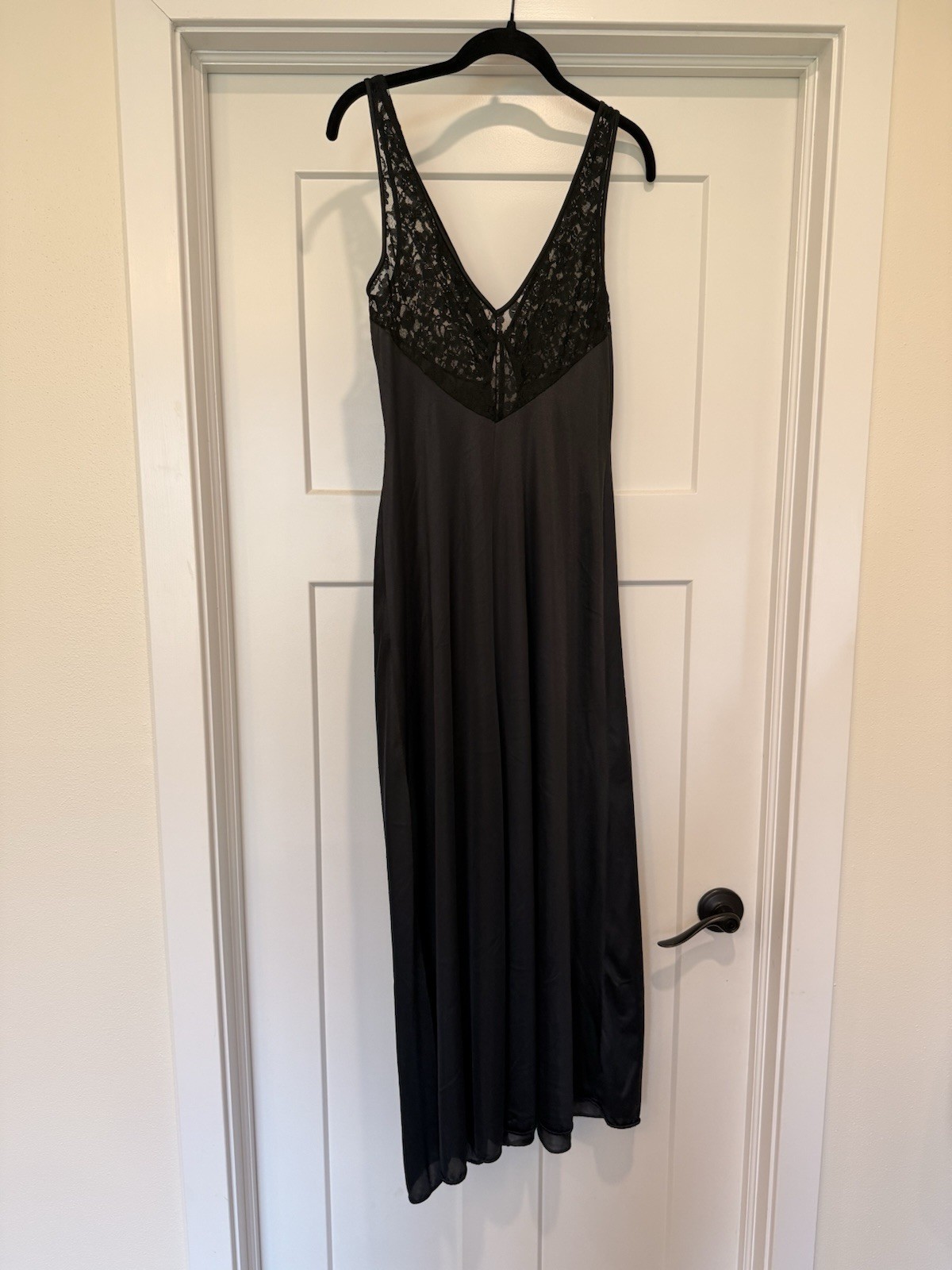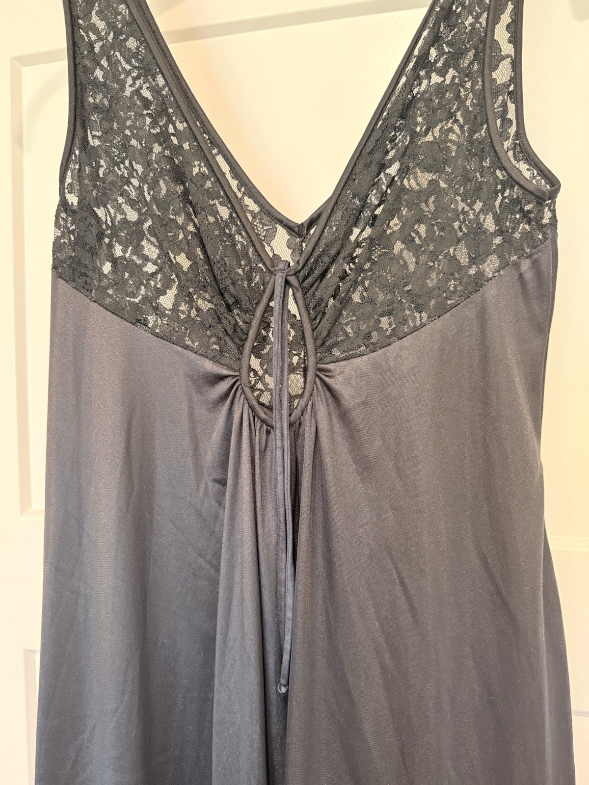 как выглядит Vtg Val Mode Med Black Nylon Long Nightgown Lace Bodice Keyhole Vampy Dark Glam фото