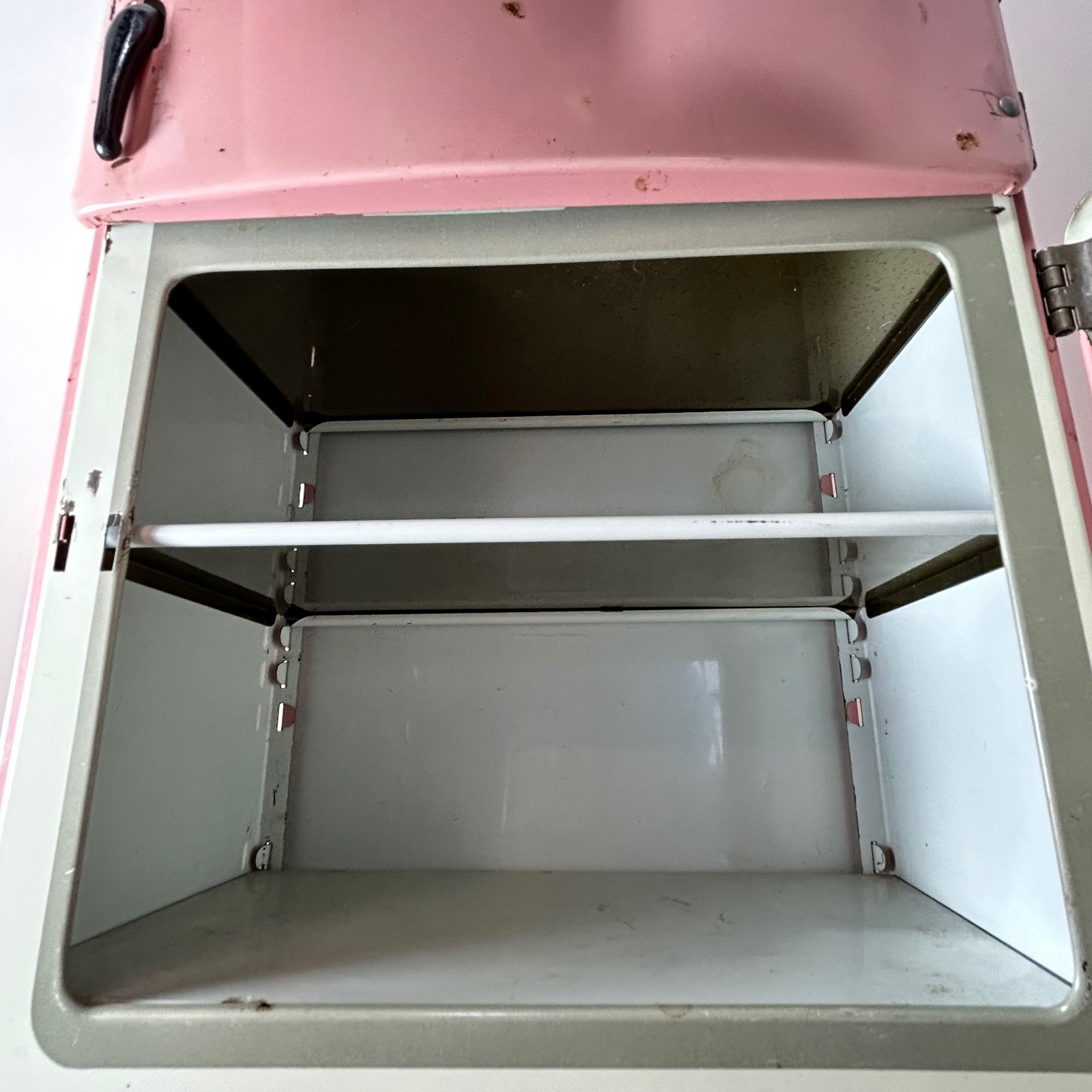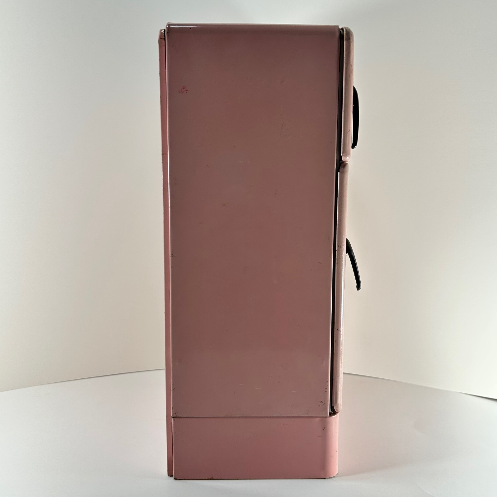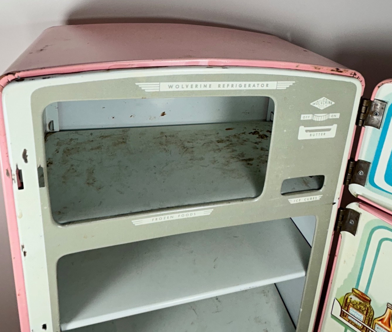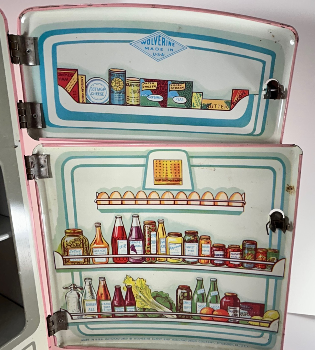 1950s Pink Wolverine Refrigerator 185 Metal Litho Toy Appliance Fridge w/ Food