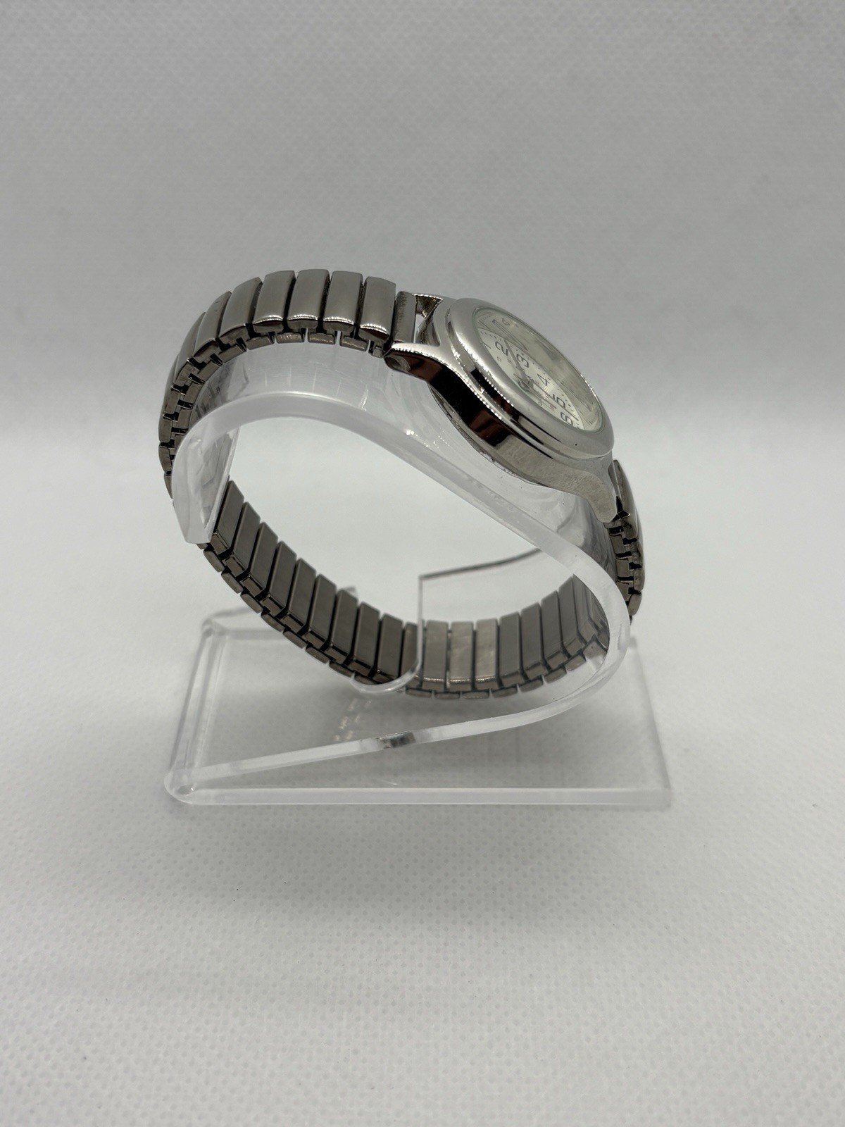 как выглядит Ladies Silver Tone Stretchy Bracelet White Dial Easy Reader Analog Watch B2 фото