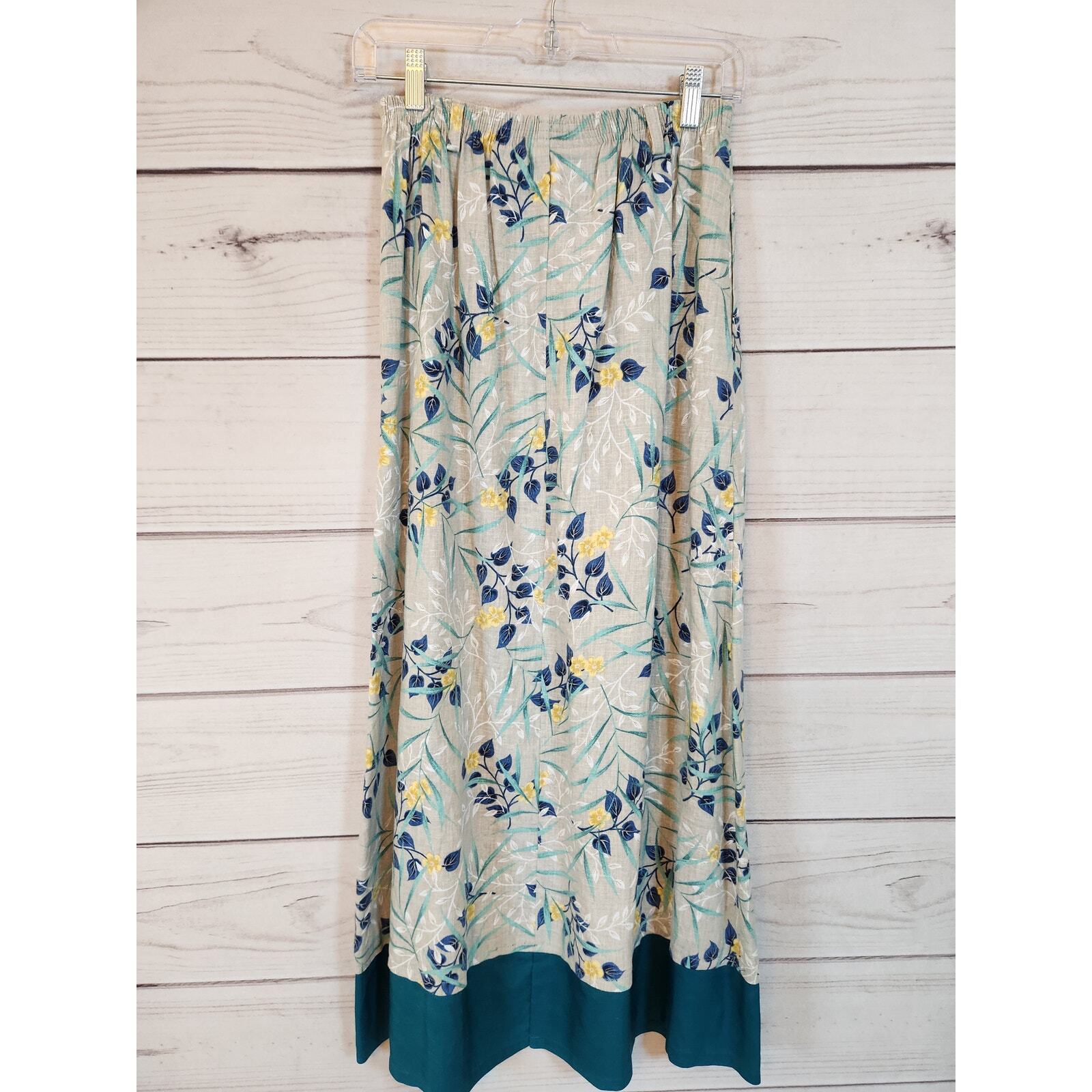 Orvis Vintage Women's Blue Tan Floral Linen Elastic Waist A-Line Midi Skirt 6