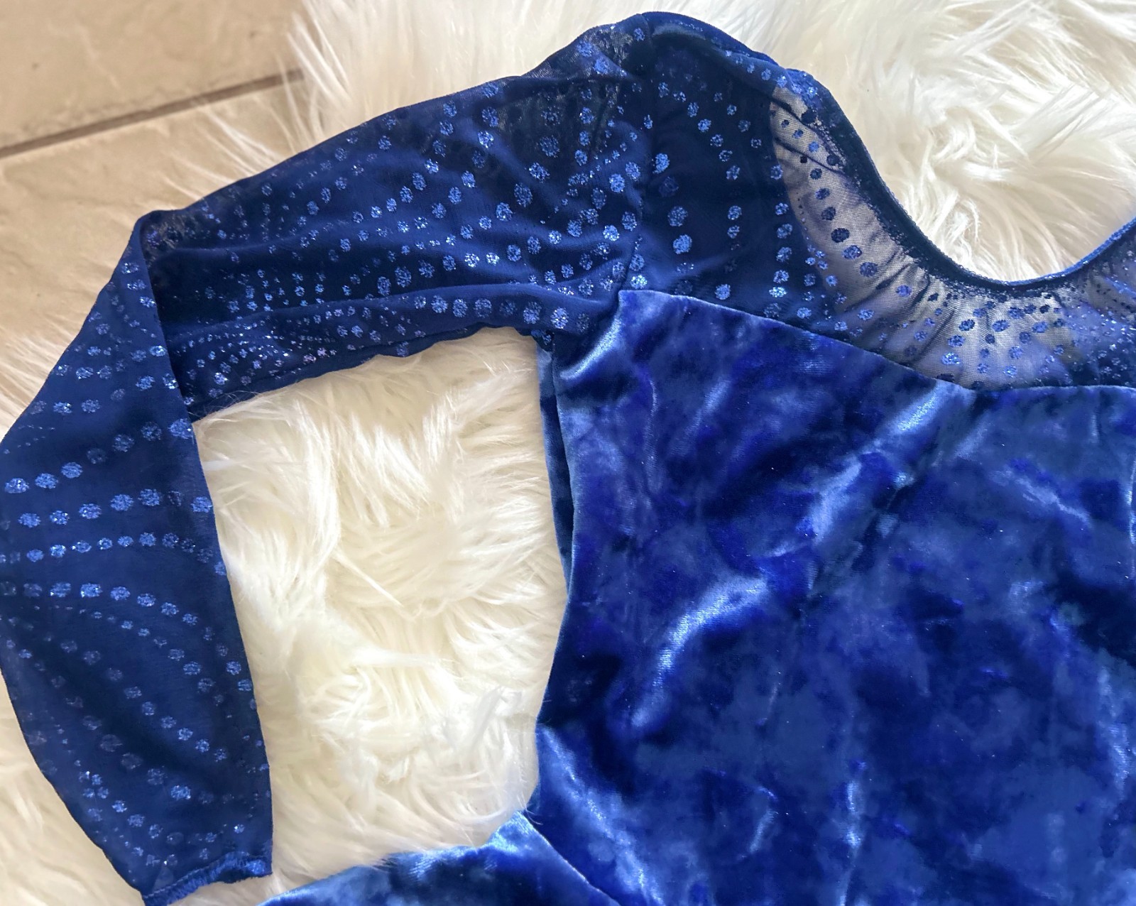 NEW Girls BLUE VELVET Glittery CHIFFON Mesh Competition FIGURE ICE SKATING Dress