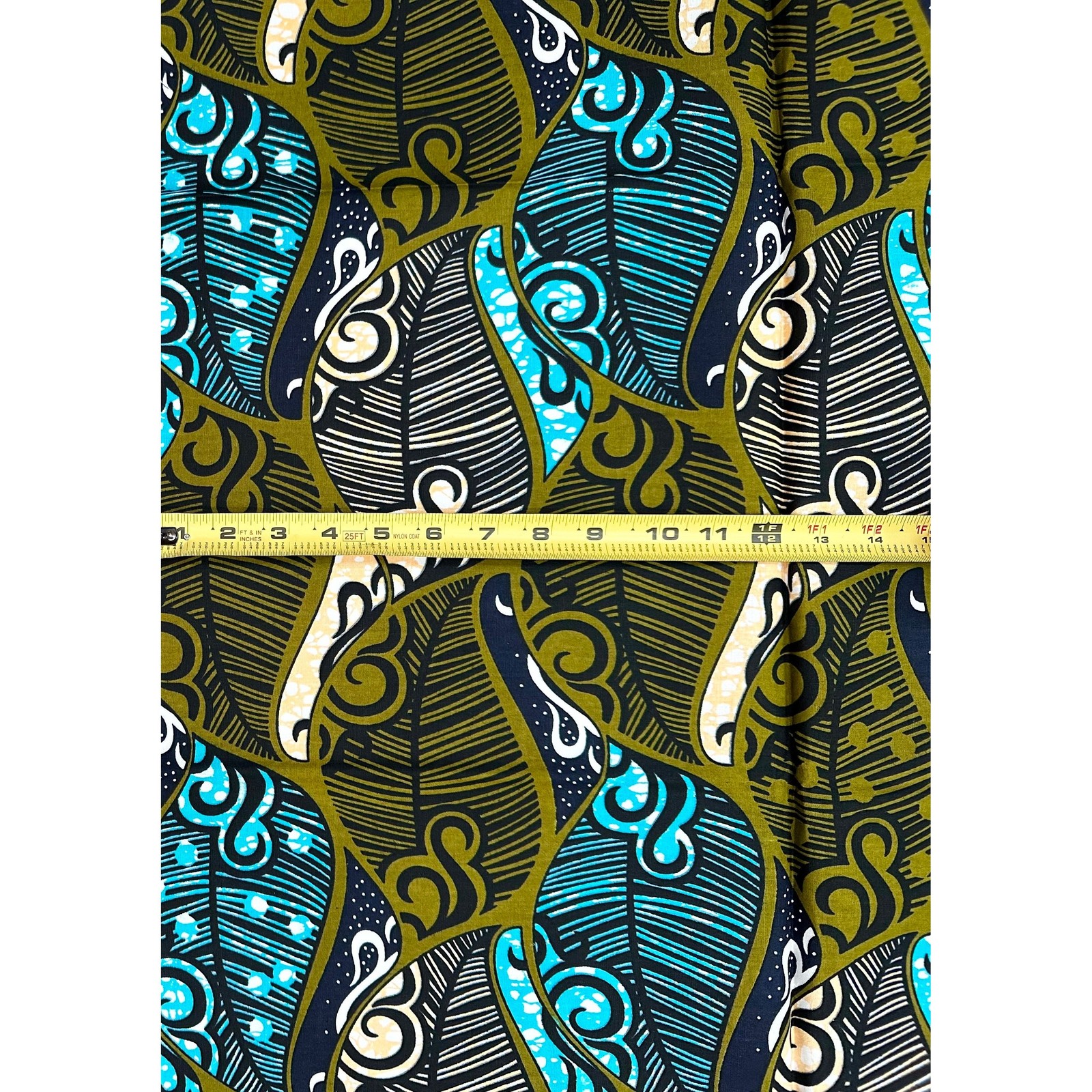 African Fabric/Ankara - Green, Blue, Beige Deep River Dey Flow Quiet, 1 Yard