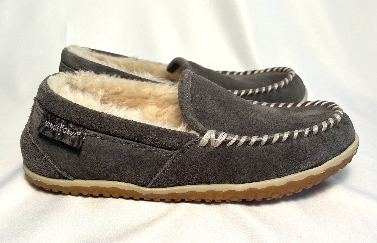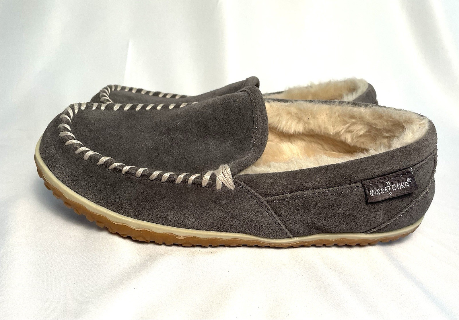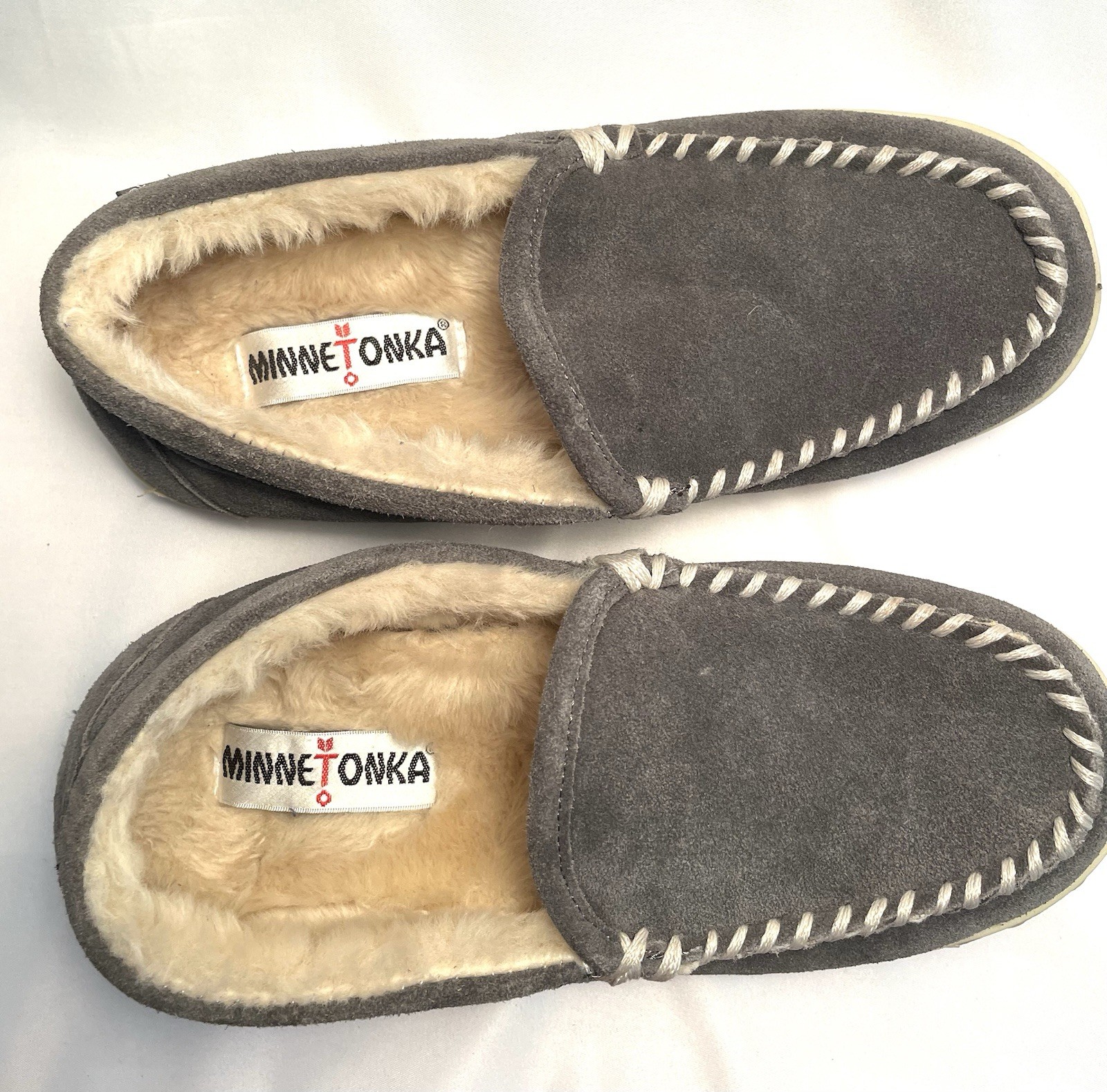 Minnetonka Vivian Slip On Moccasin Loafers Suede Sherpa Lined grey Womens 8