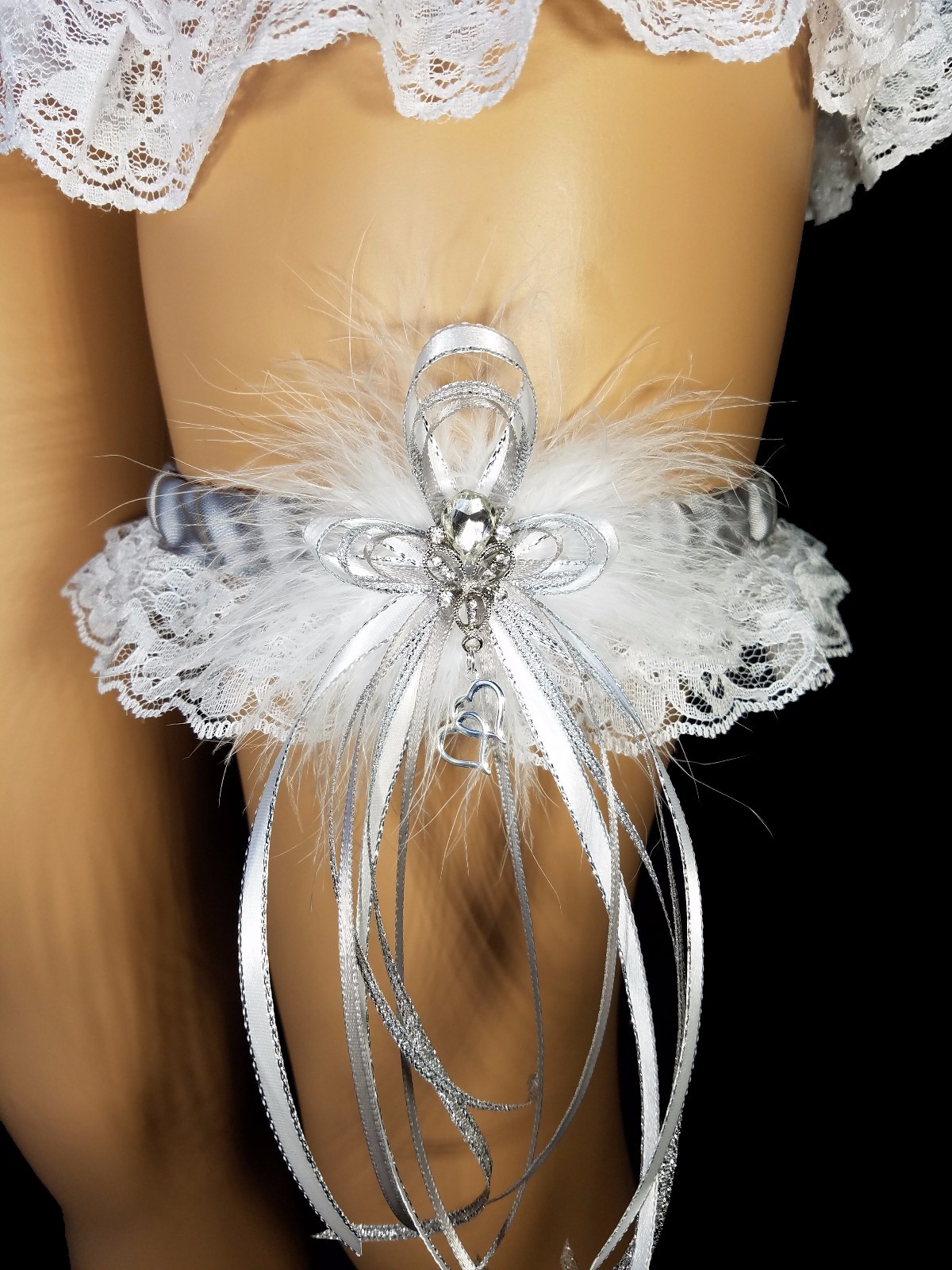 PLUS SIZE Gray Silver and White Lace GARTER FEATHERS Prom Wedding Special Bridal