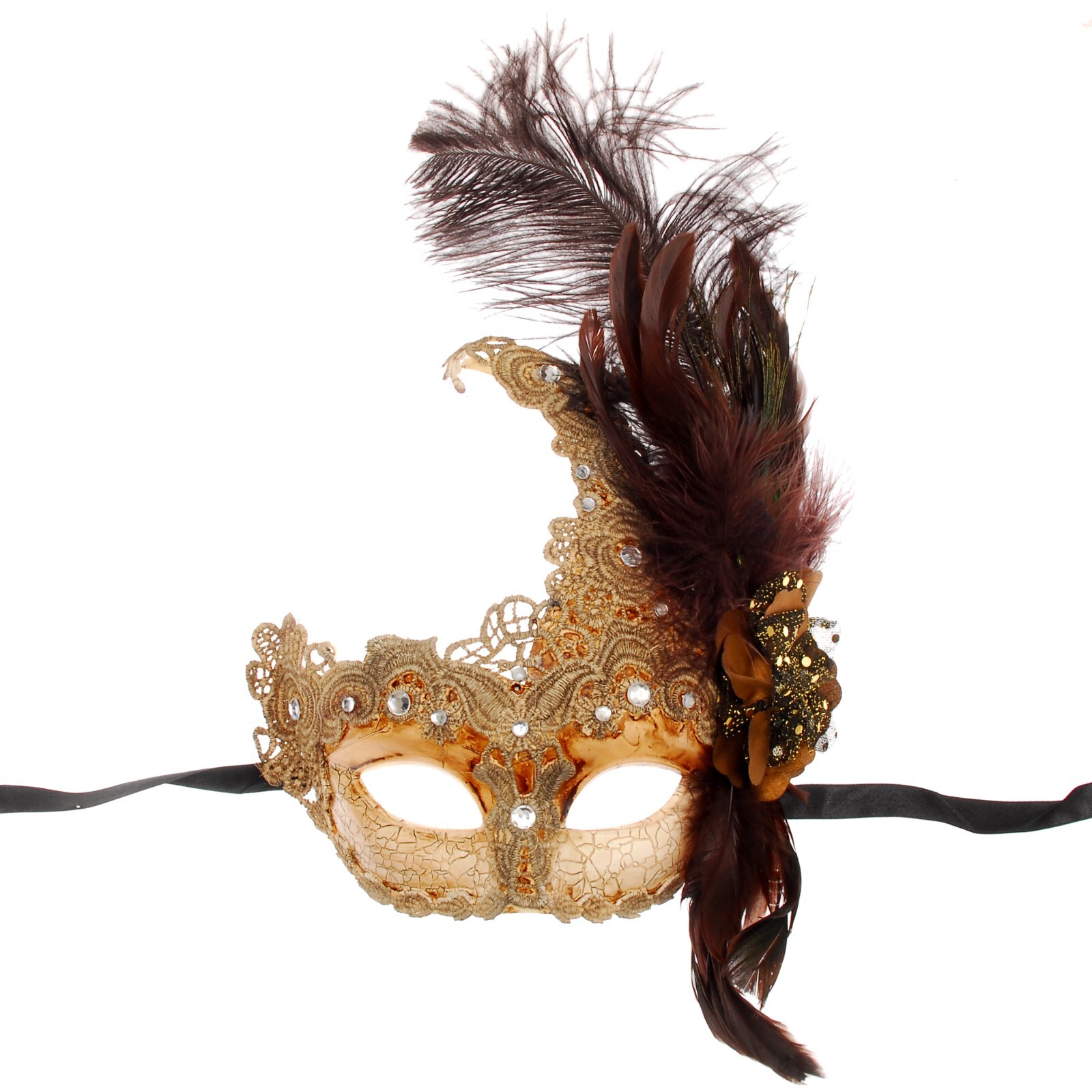 Venetian Brocade Lace Mardi Gras Masquerade Ball Mask with Feathers Ivory