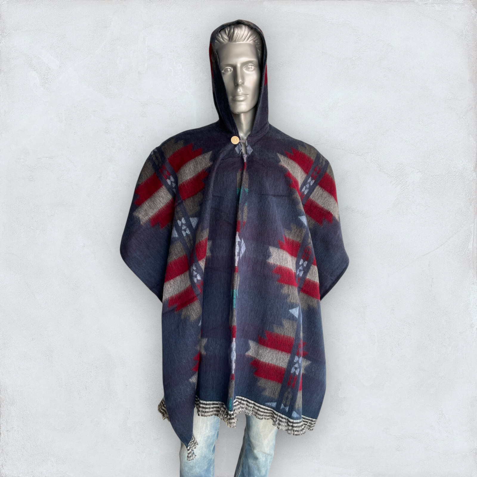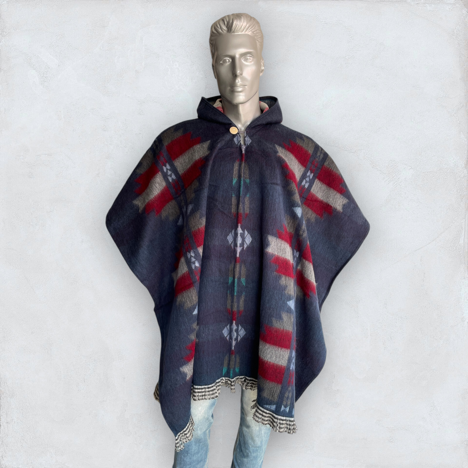 Alpaca Poncho Hooded in blue Soft Comfortable Wool Navajo Design Handcrafted