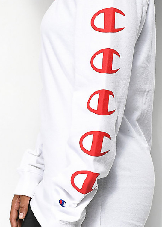 как выглядит Champion Script White Unisex Long Sleeve T-Shirt Champion logos down the left фото