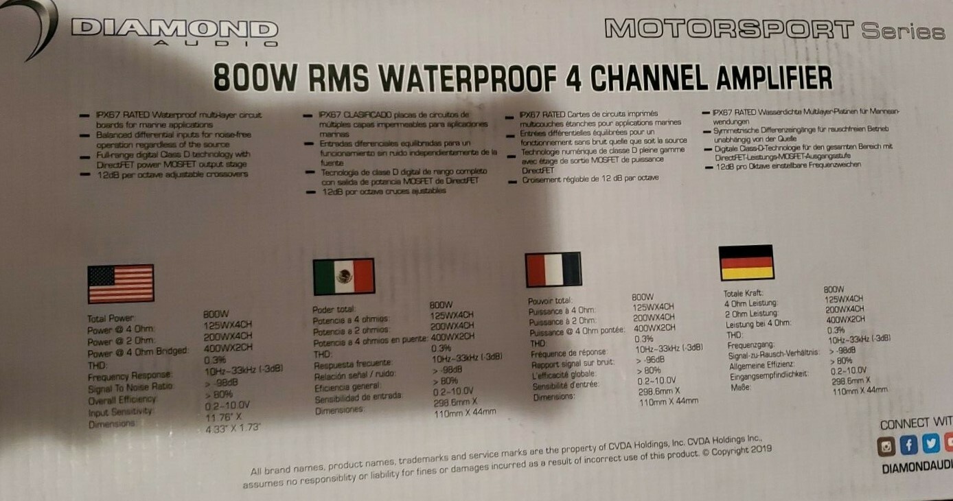 Diamond Audio DXM800.4D 800W RMS 4-Channel Compact Water Resistant Amp Harley