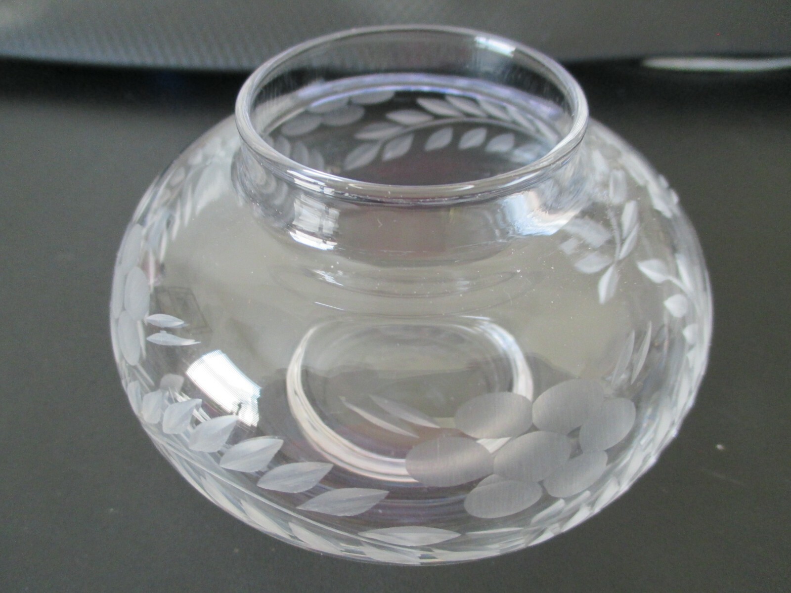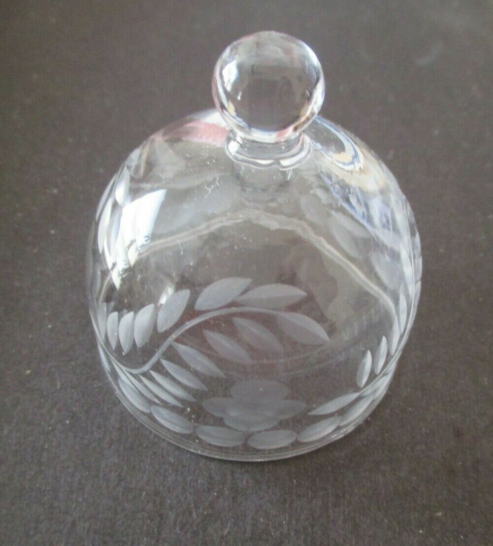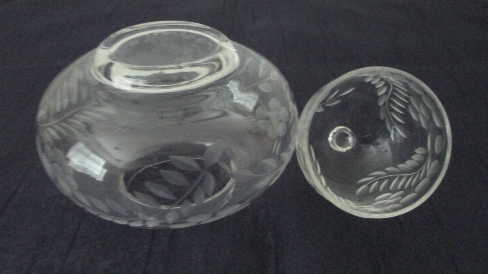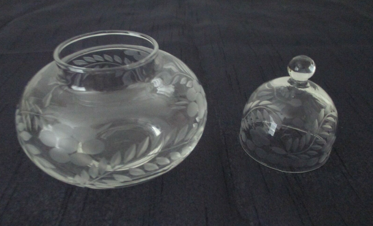 как выглядит Clear Glass Lidded Trinket Box Round 3 1/2" Etched Flower/Leaves Pattern NOS фото