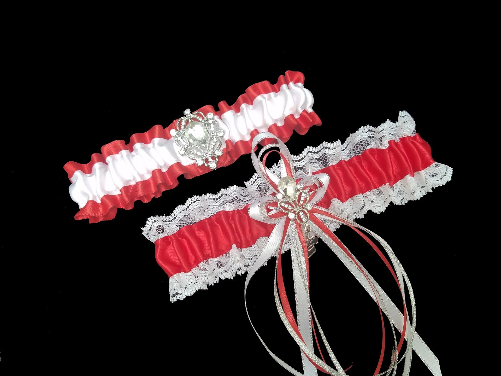 Set of 2 Red Satin White Lace Wedding Prom Bridal Garter Belt with Rhinestones