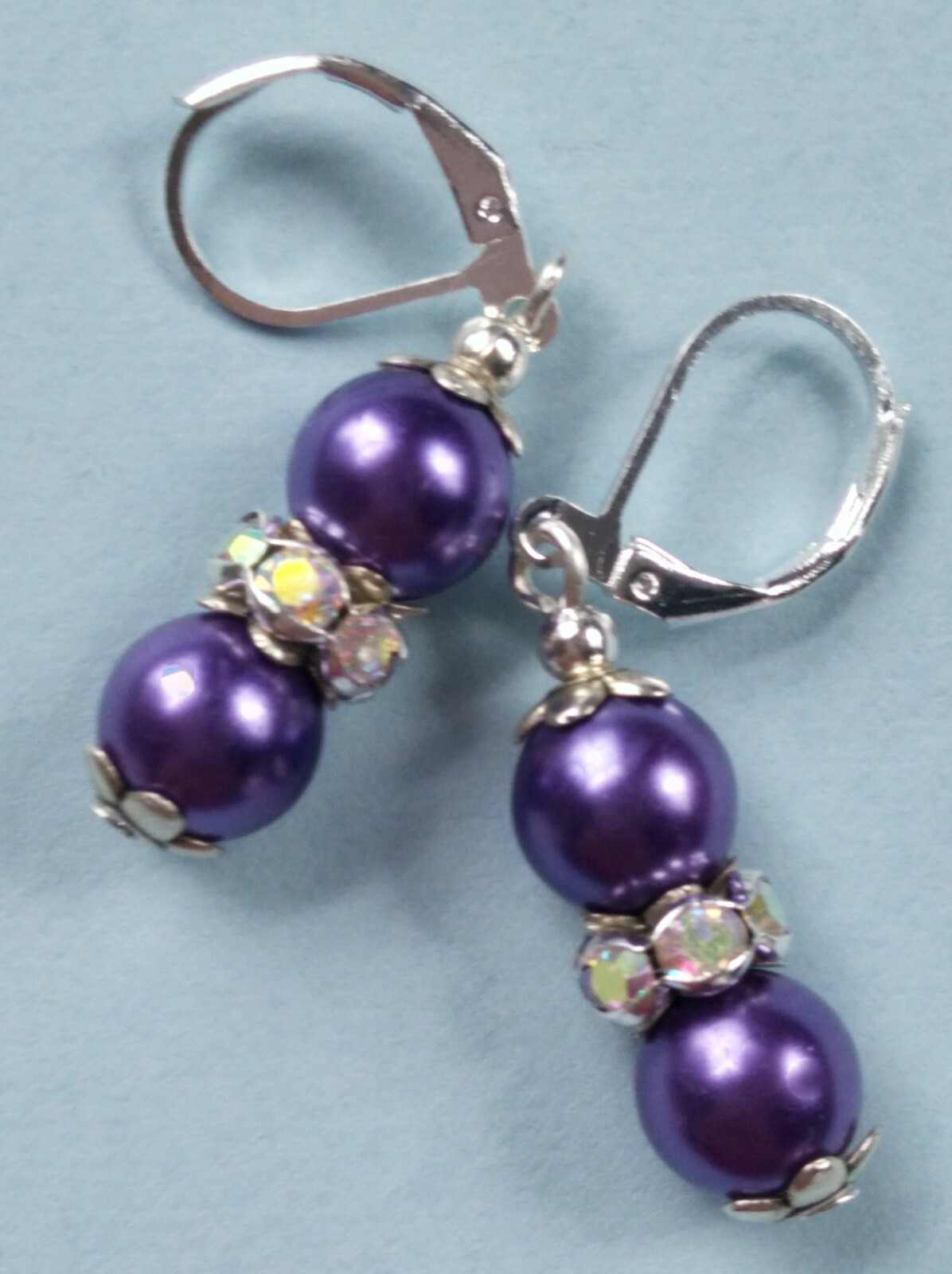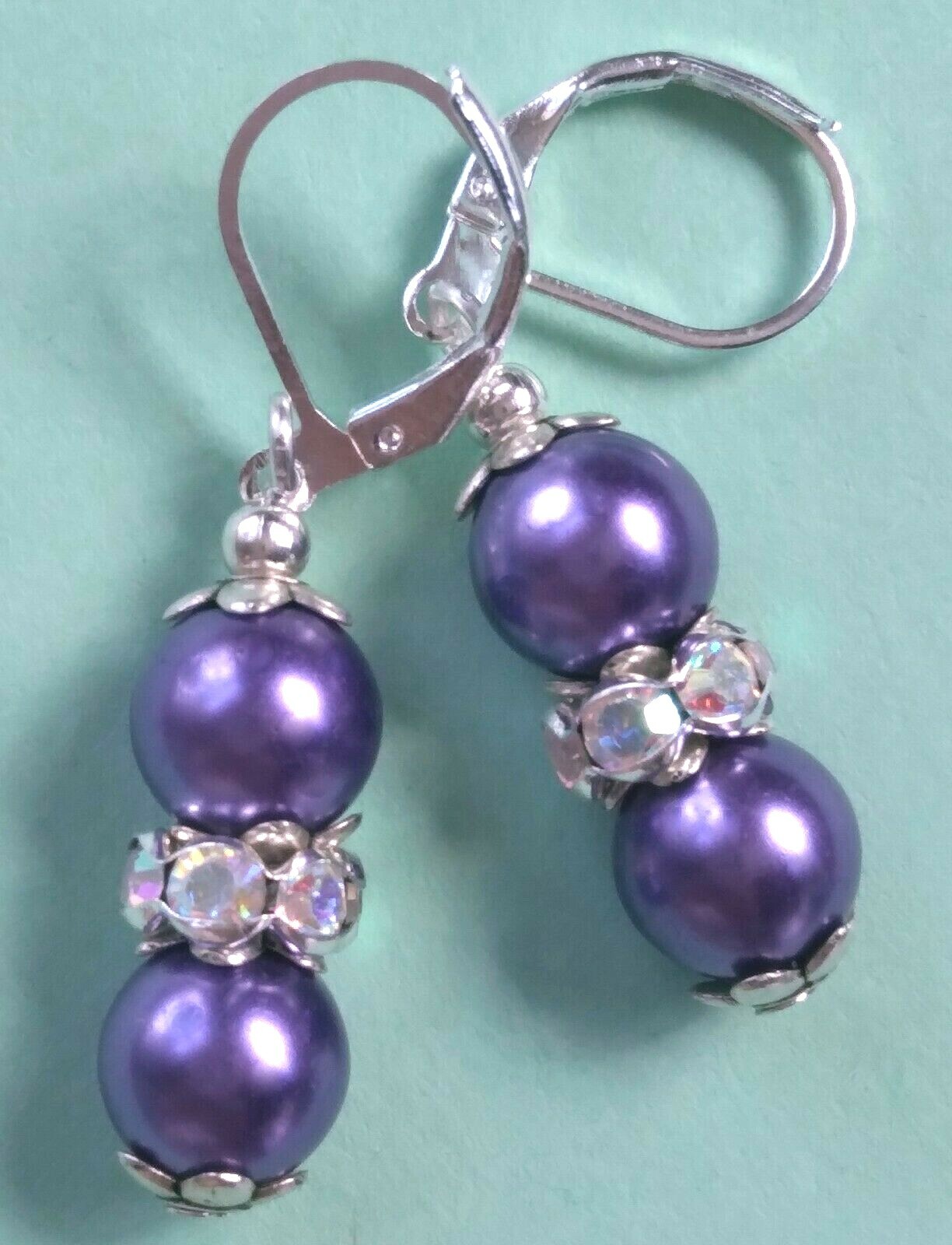 PURPLE GLASS PEARL Crystal earring SP Leverback handcrafted
