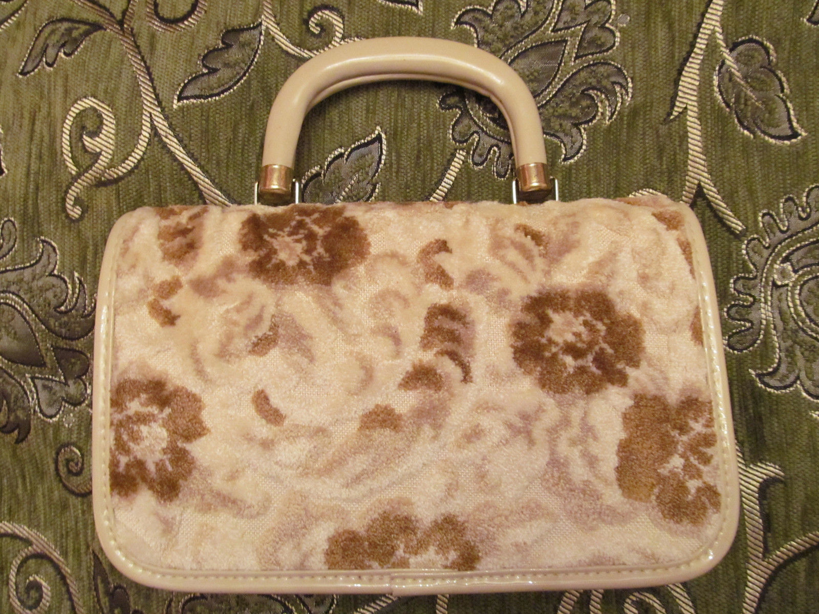 как выглядит vintage 50s JACLYN USA raised velvet tapestry tan beige floral hand bag purse фото