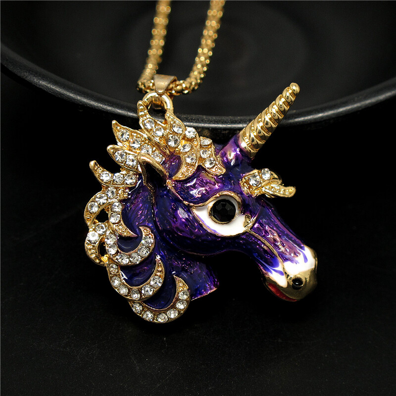как выглядит Fashion Women Purple Enamel Rhinestone Mini Unicorn Pendant Chain Necklace фото