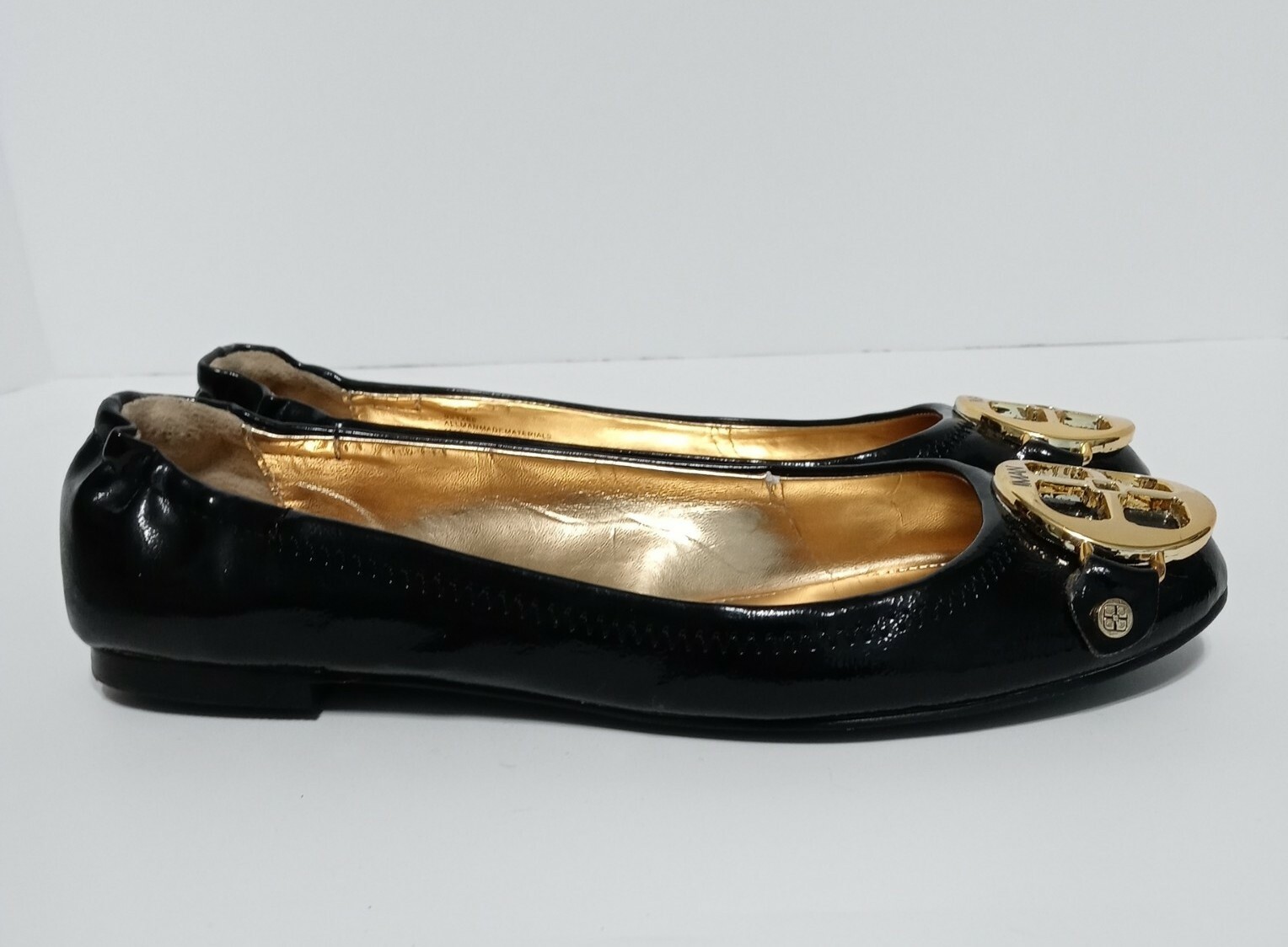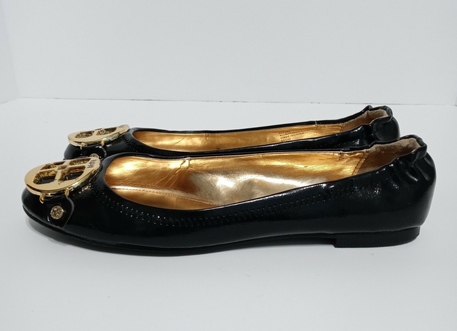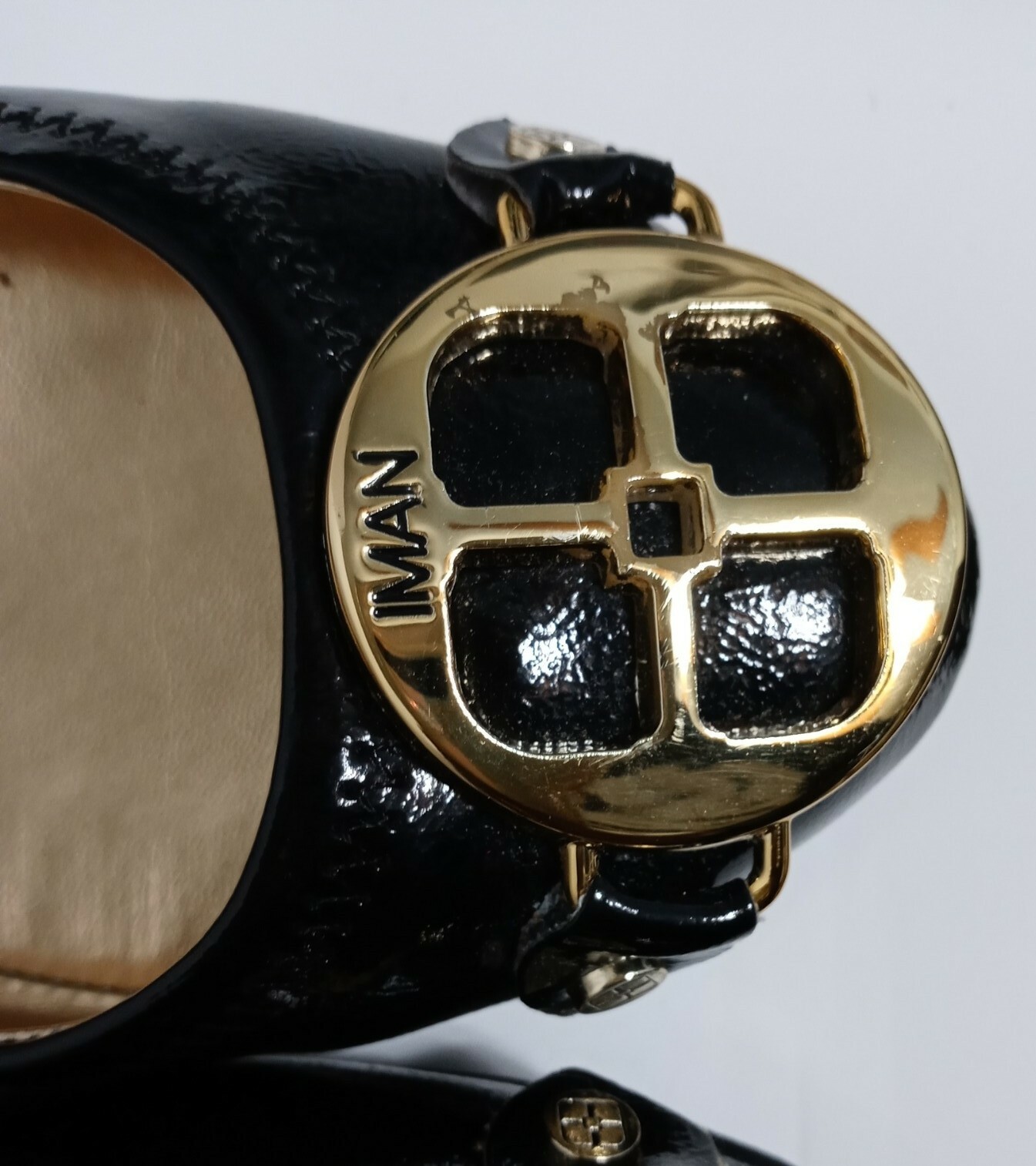 как выглядит Iman Black Patent Ballet Flats Global Chic 6.5 W Signature Gold Logo 921286 фото