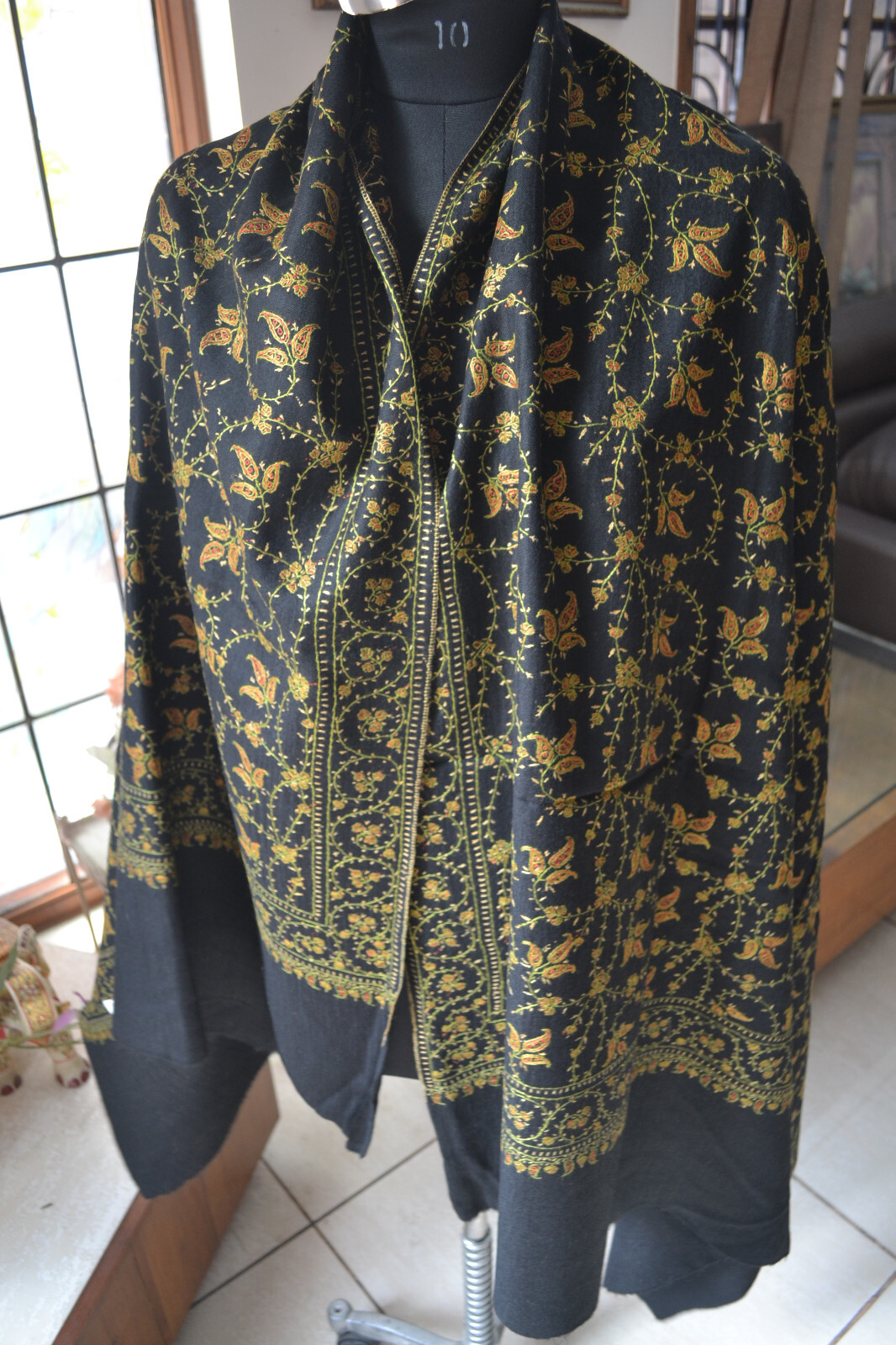 как выглядит BLACK MICRO JAAL KASHMIRI EMBROIDERY SHAWL 100 CASHMERE PASHMINA фото