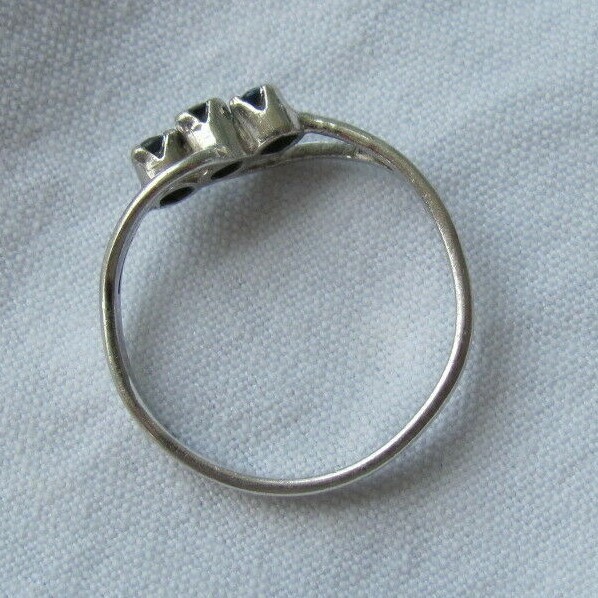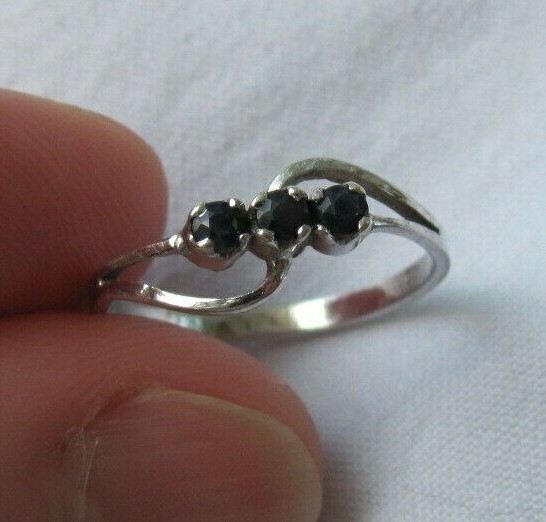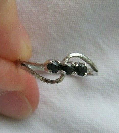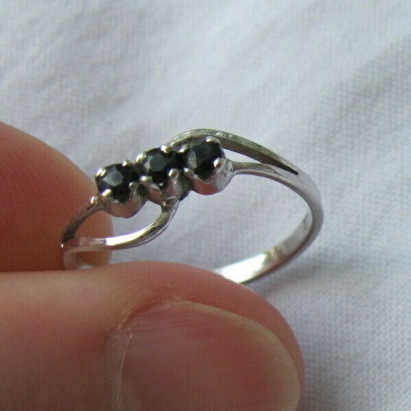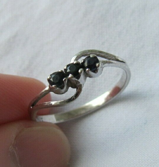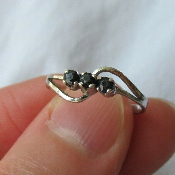 как выглядит Sterling Silver Petite 3-Stone Midnight Blue Black Sapphire Band Ring Size 6.25 фото