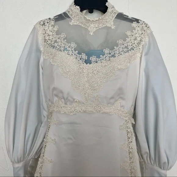 как выглядит 1970s vintage wedding gown long sleeve lace XS white cream 77 sheer фото