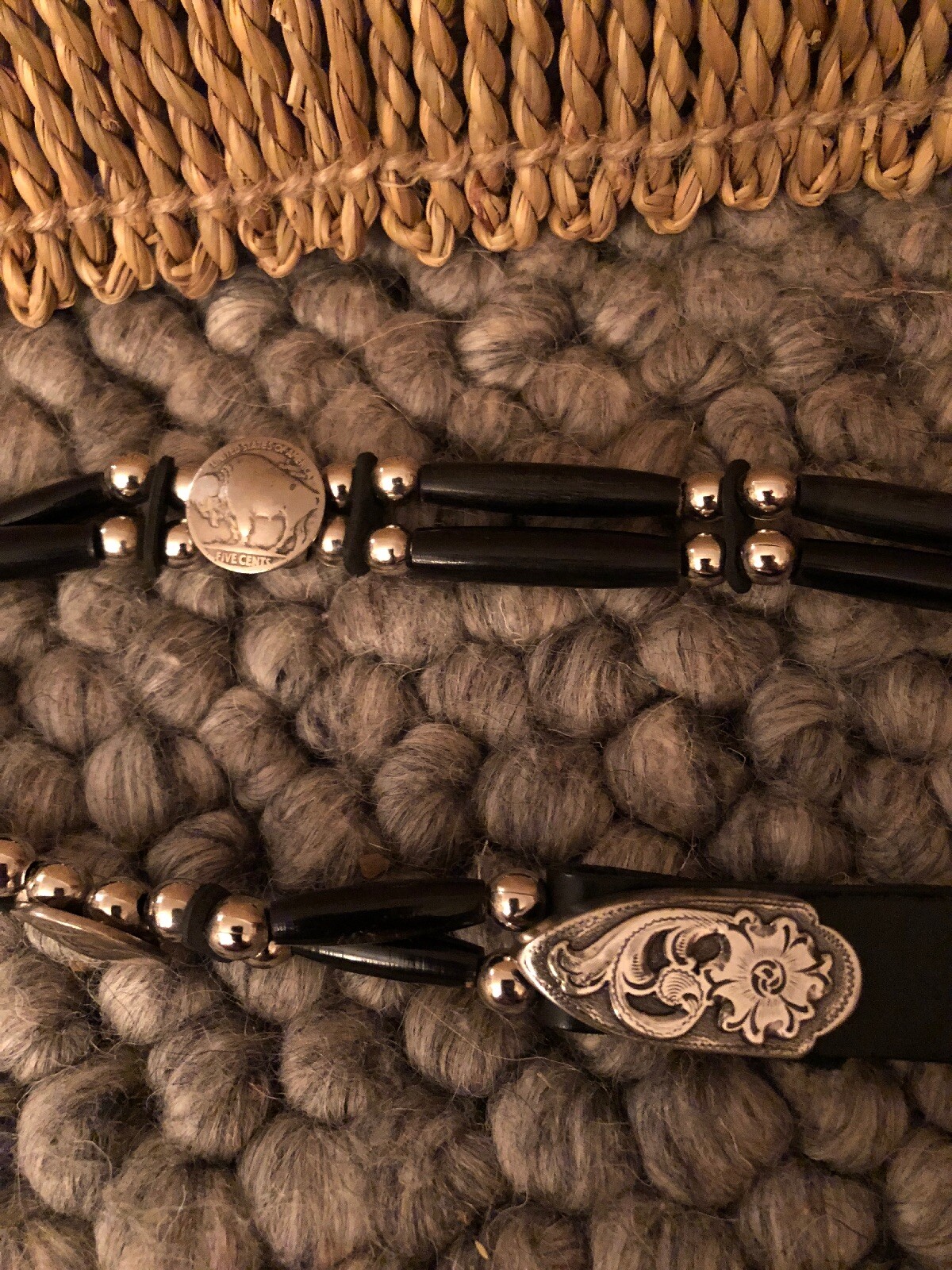 Black Leather With Beads and Buffalo Nickel Design Adornment Women s Belt