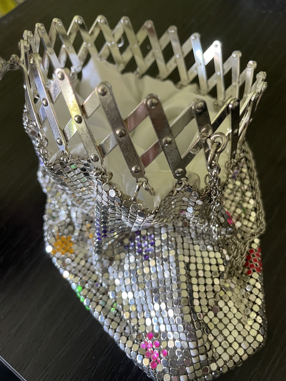 Vintage Silver Metal Mesh Bag Coin Purse Beggars Bag With Expandable Top Cage