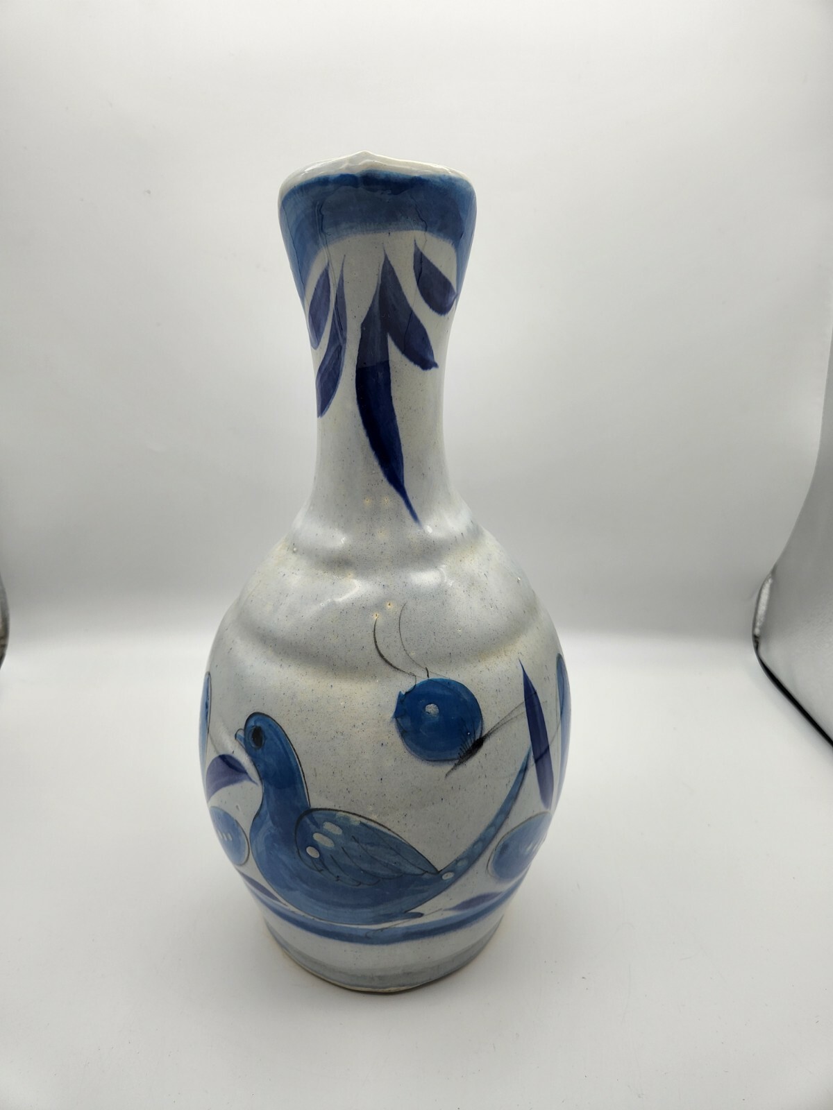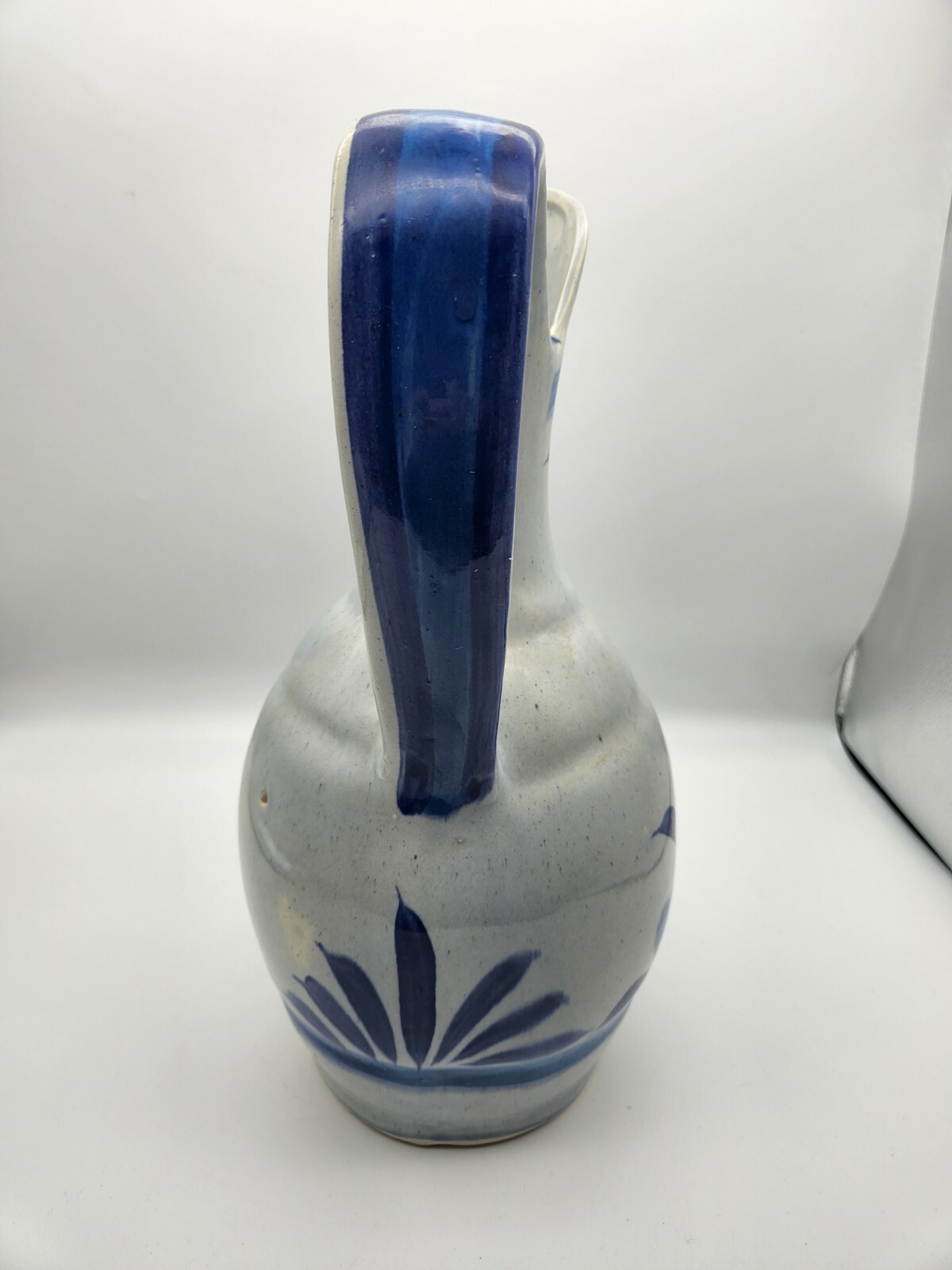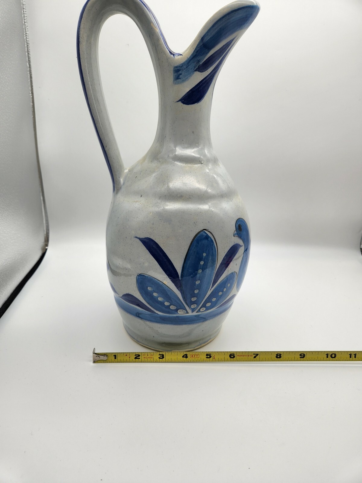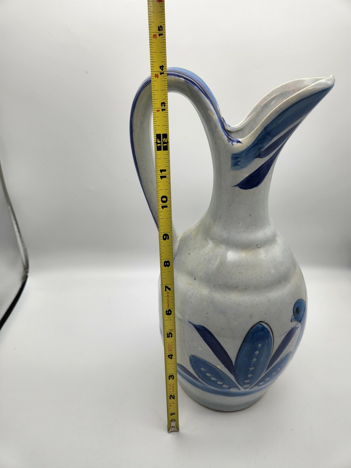 • Mexican handmade pottery tall pitcher with blue bird and leaves grey blue