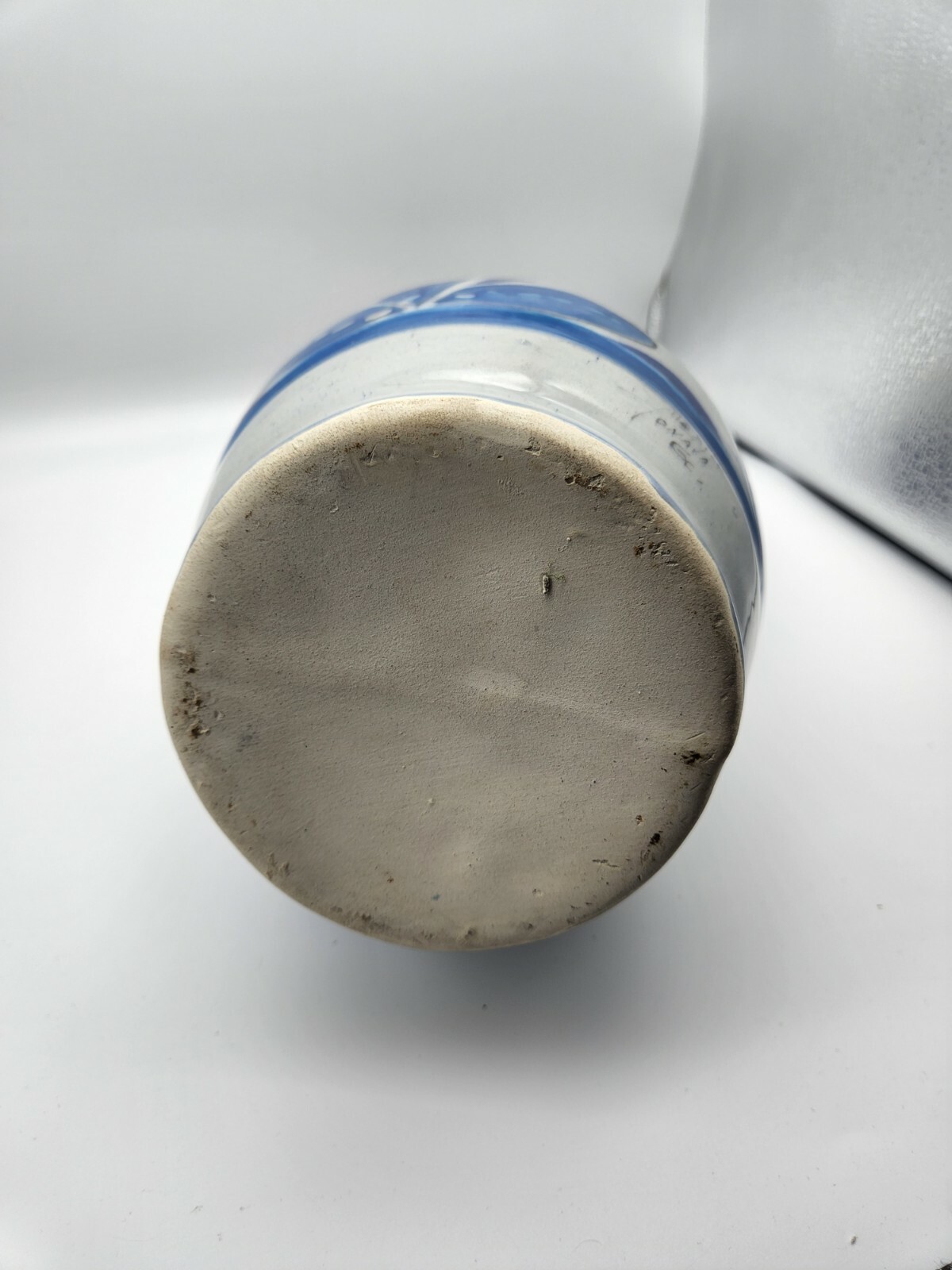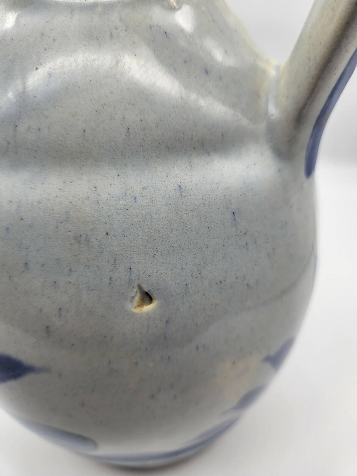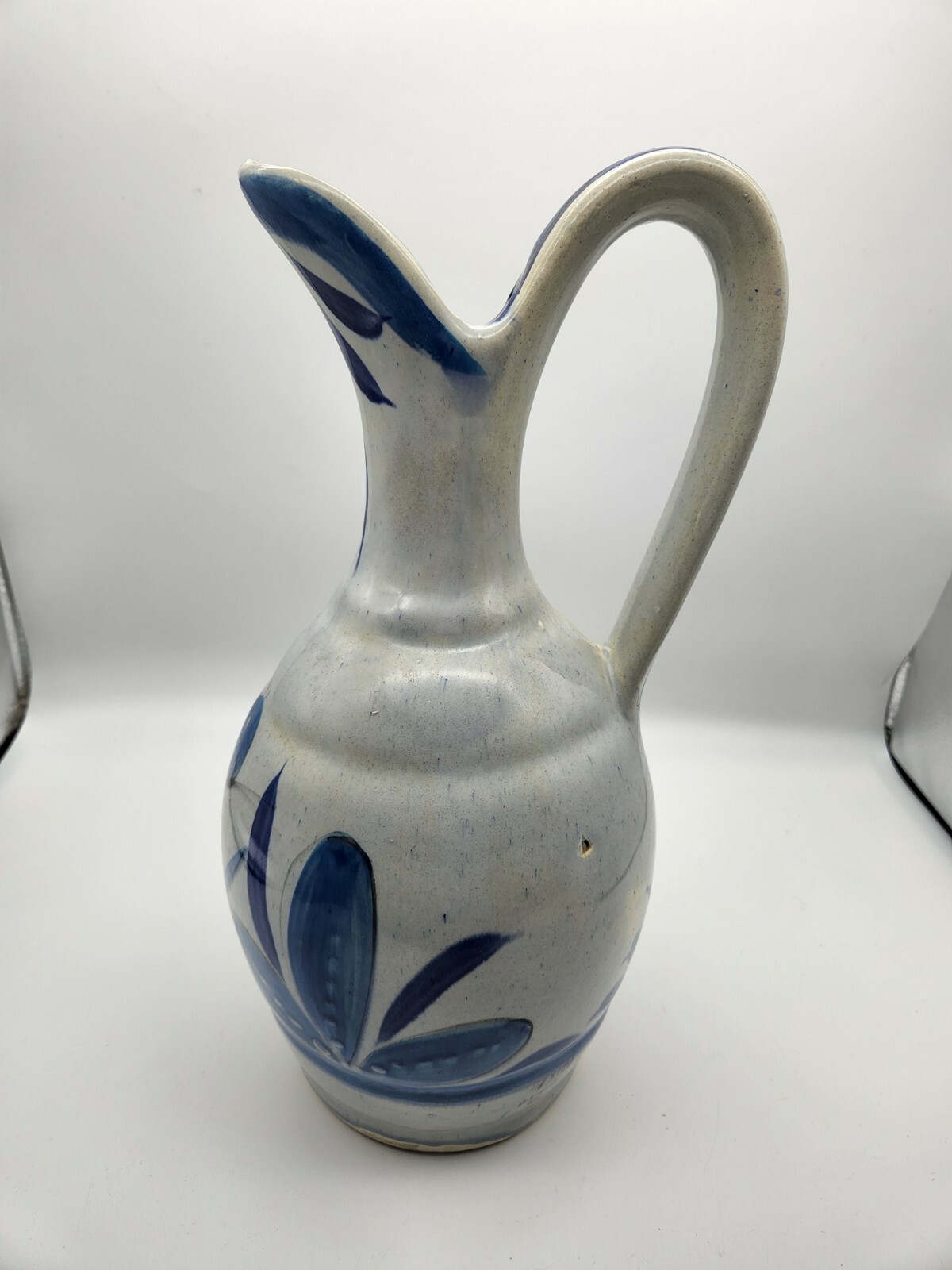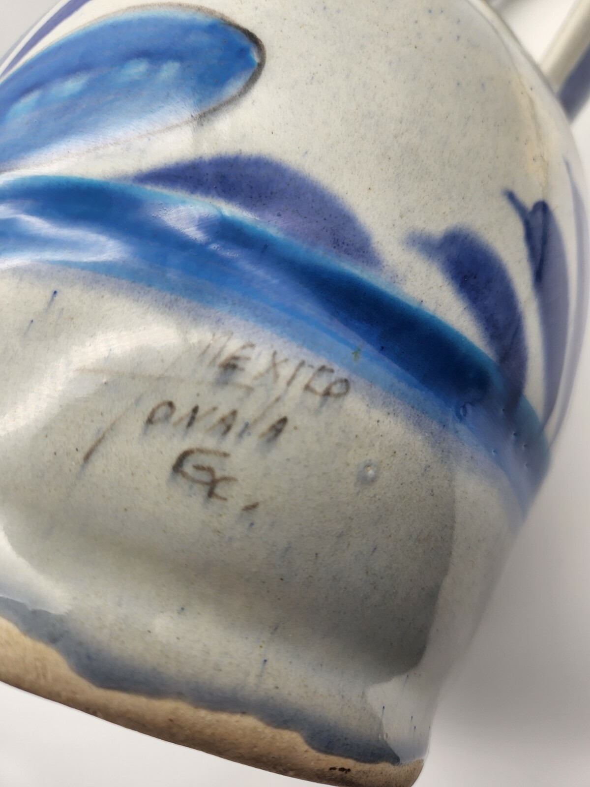 • Mexican handmade pottery tall pitcher with blue bird and leaves grey blue