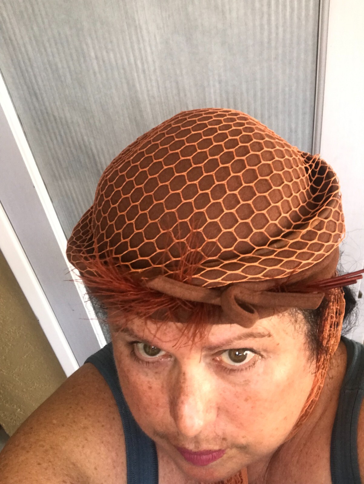 как выглядит RARE VINTAGE TONI OF CALIFORNIA FINE BROWN ORANGE LONG MESH WRAP HAT MILLINERY фото