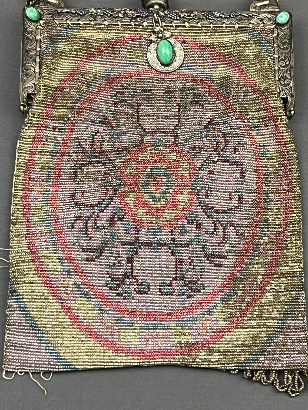 Antique French Turquoise Steel Micro-Beaded Purse Cabochons Swan Frame 164