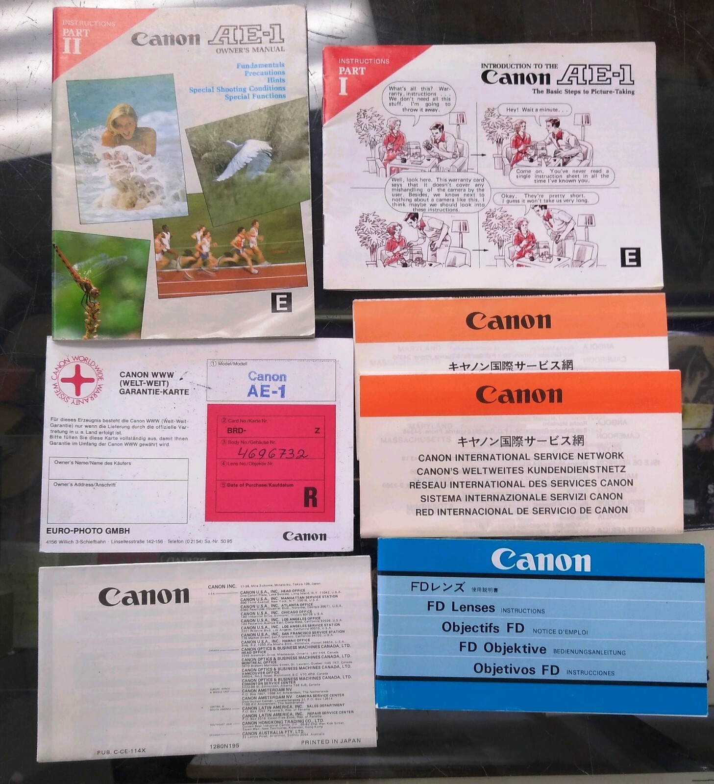 Canon AE-1 vintage SLR film Camera w/ additional lens and flash manuals