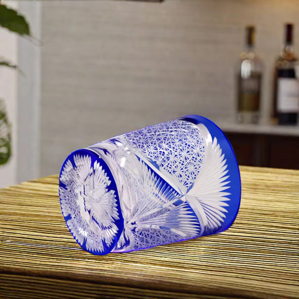 Japanese Style Edo Kiriko Drinking Glass 9oz Blue Crystal Whiskey Scotch Glass