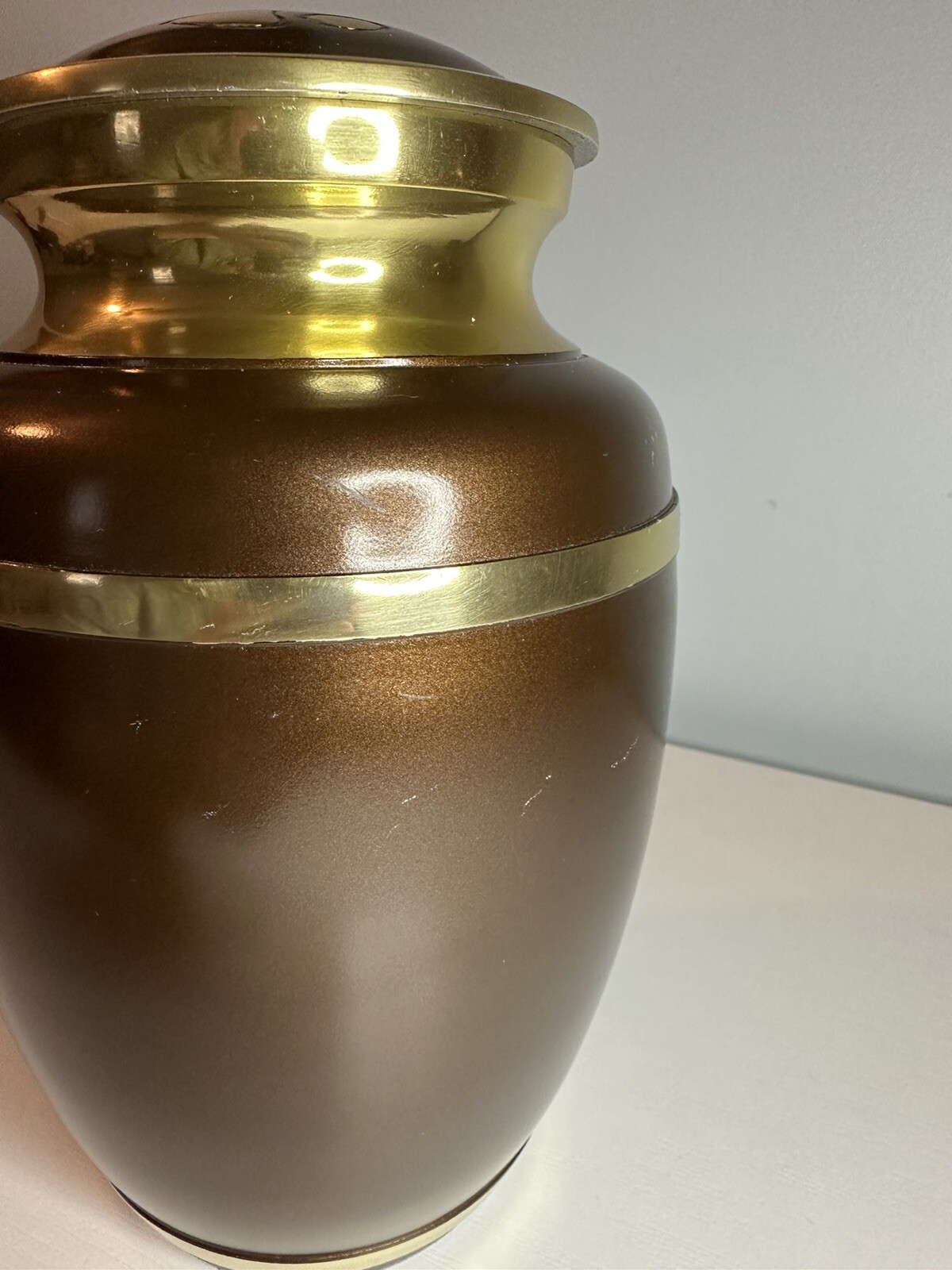 как выглядит Rochford pet urn brown with gold never been used фото