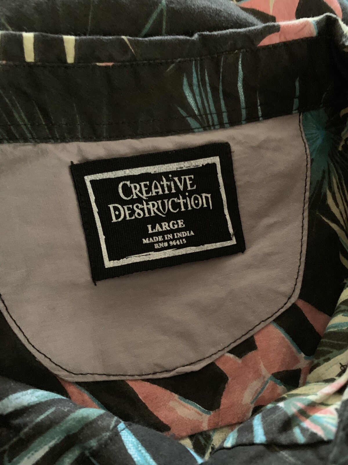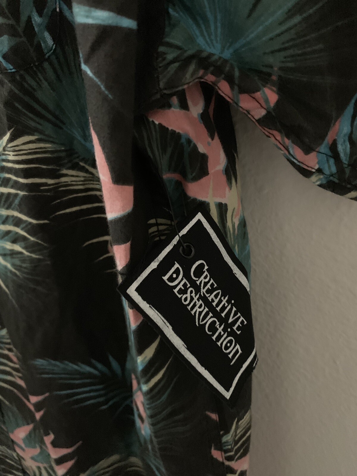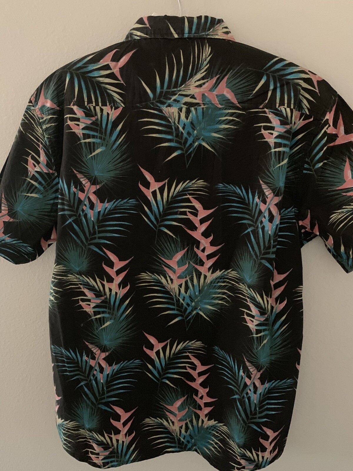 как выглядит NWT L Hawaiian Faded Black Tropical Leaves Button Shirt Large Pink Blue Leaf фото